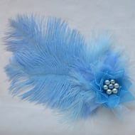 Complemented with dark cerise pink biot feathers and finished with a navy satin ribbon ruffle and a cluster of dark cerise pink glass pearls.