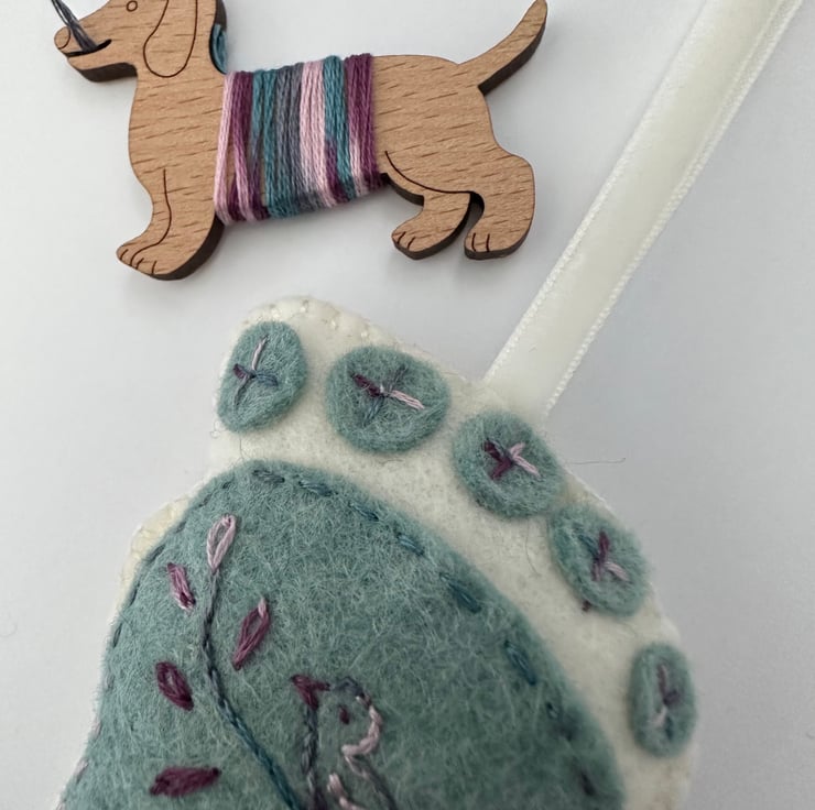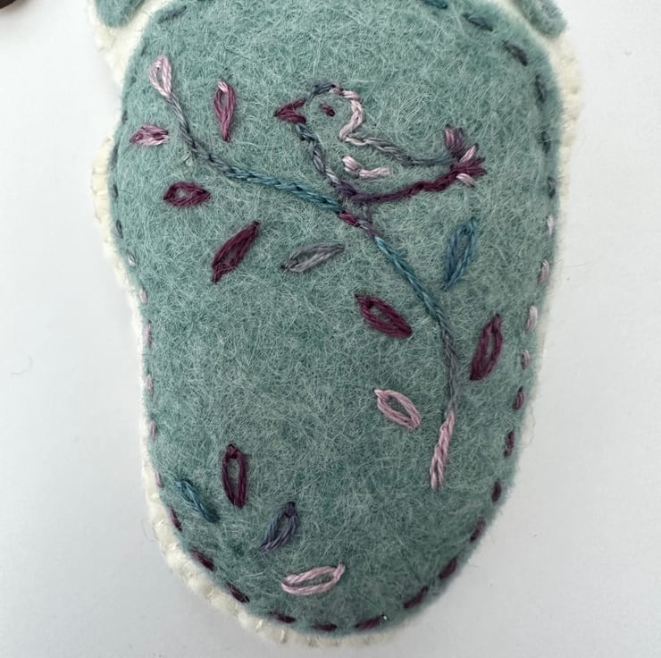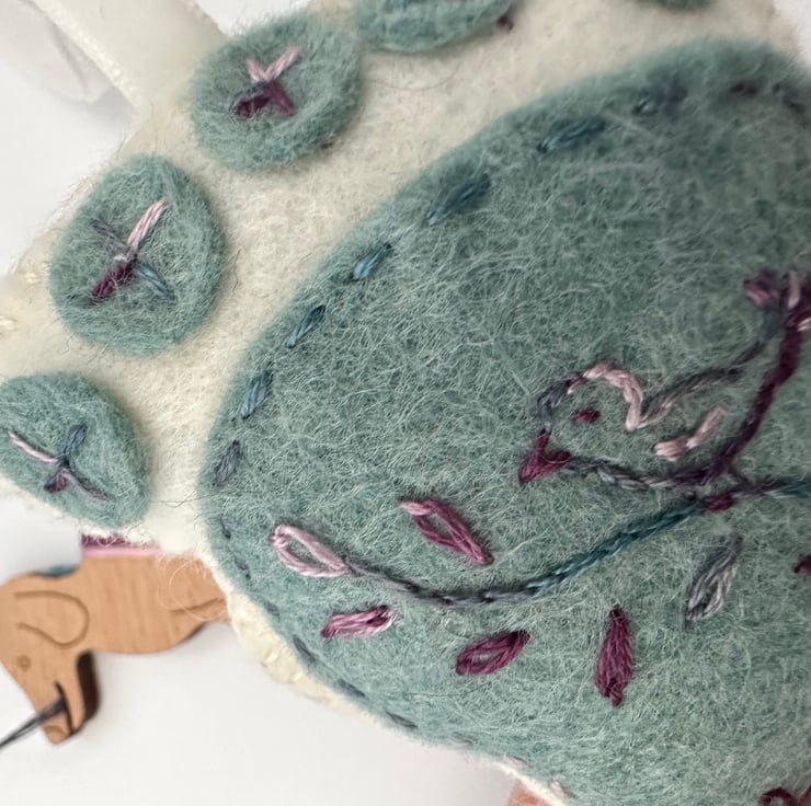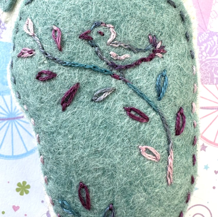 Made using the softest quality high (40%) wool content felt front and back, DMC cotton threads which change colour through shades of pinks, purples, turquoise and grey with a pretty velvet ribbon to hang it with.