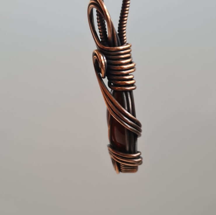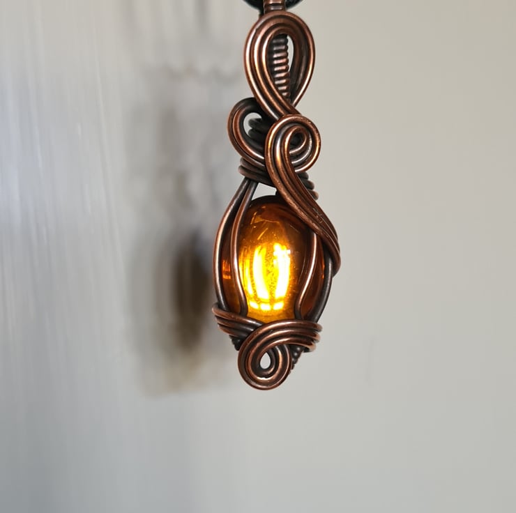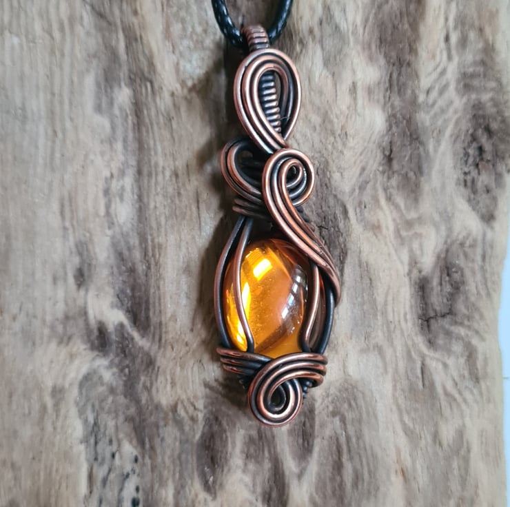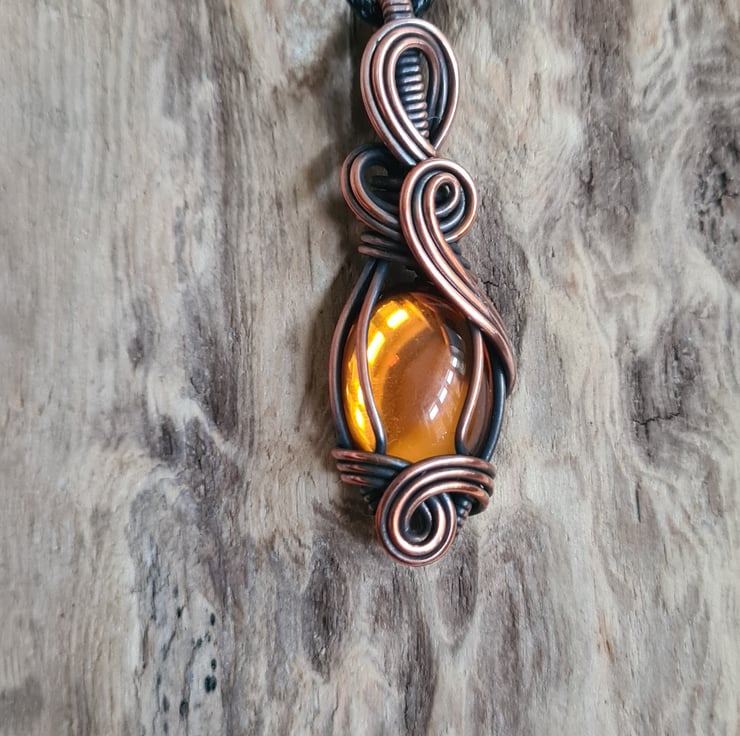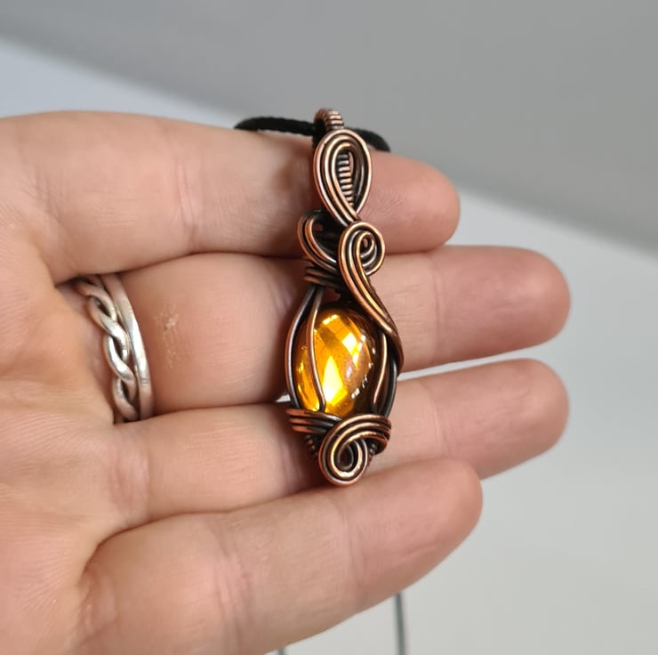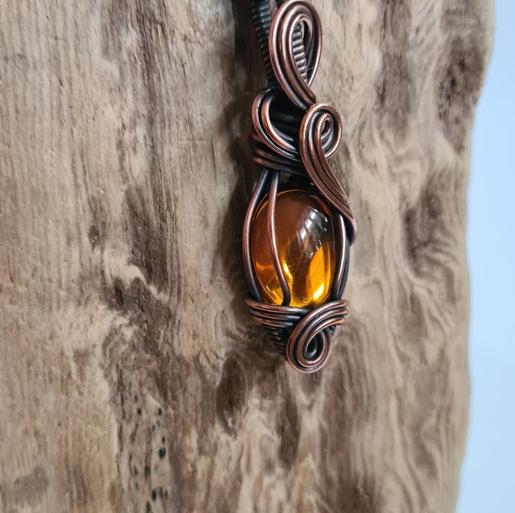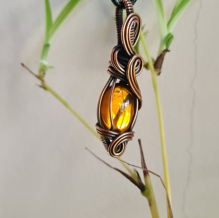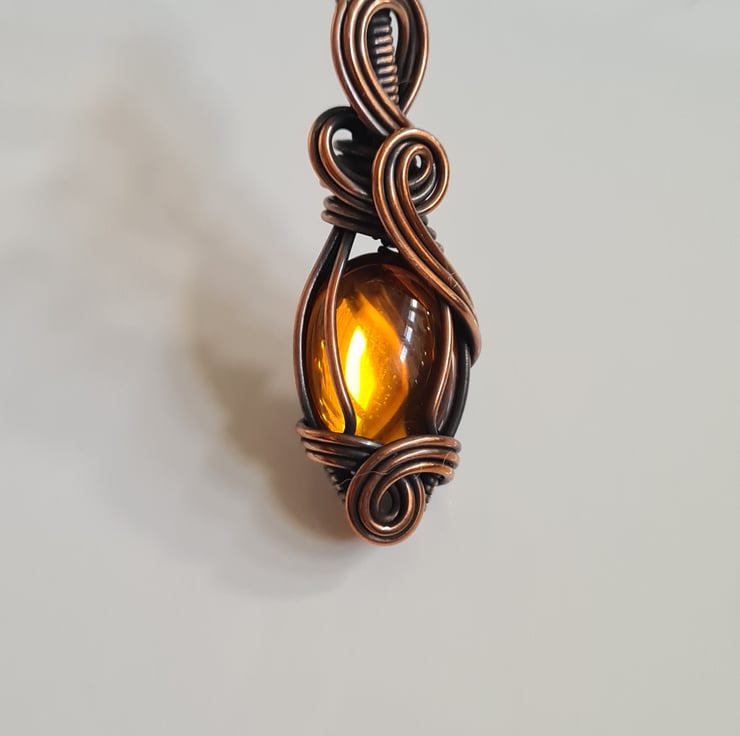 I have taken this gorgeous and bright, foil backed, yellow/amber coloured glass cabochon and hand wrapped it in raw copper, which I have then antiqued and polished for the final effect.