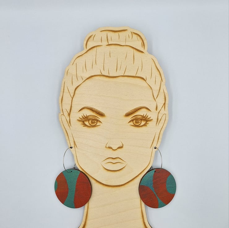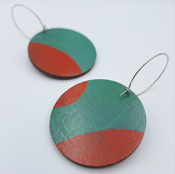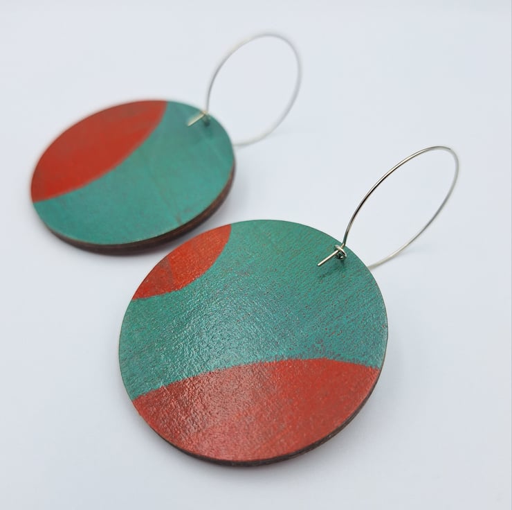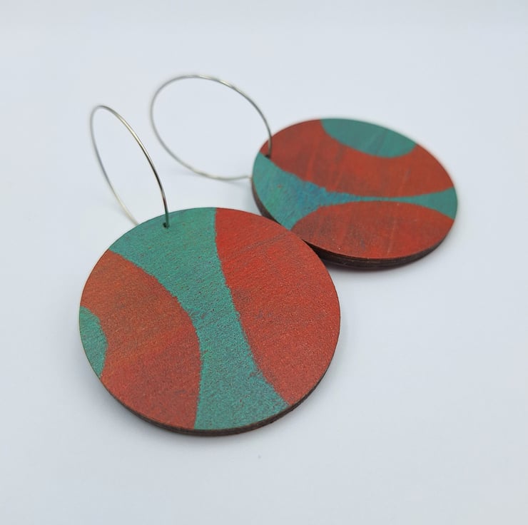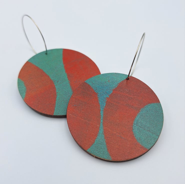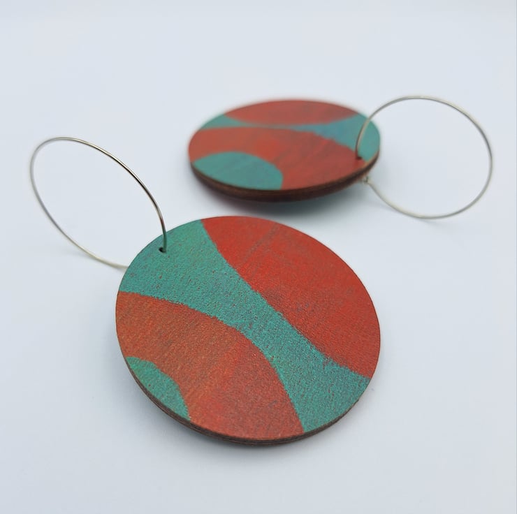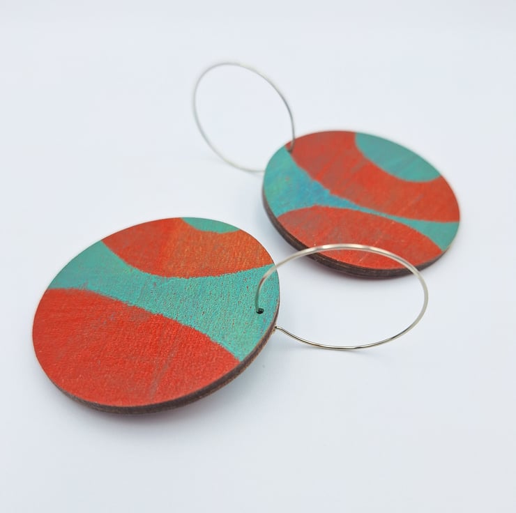 Large red and green wooden earrings with silver plated hoops, hand printed.