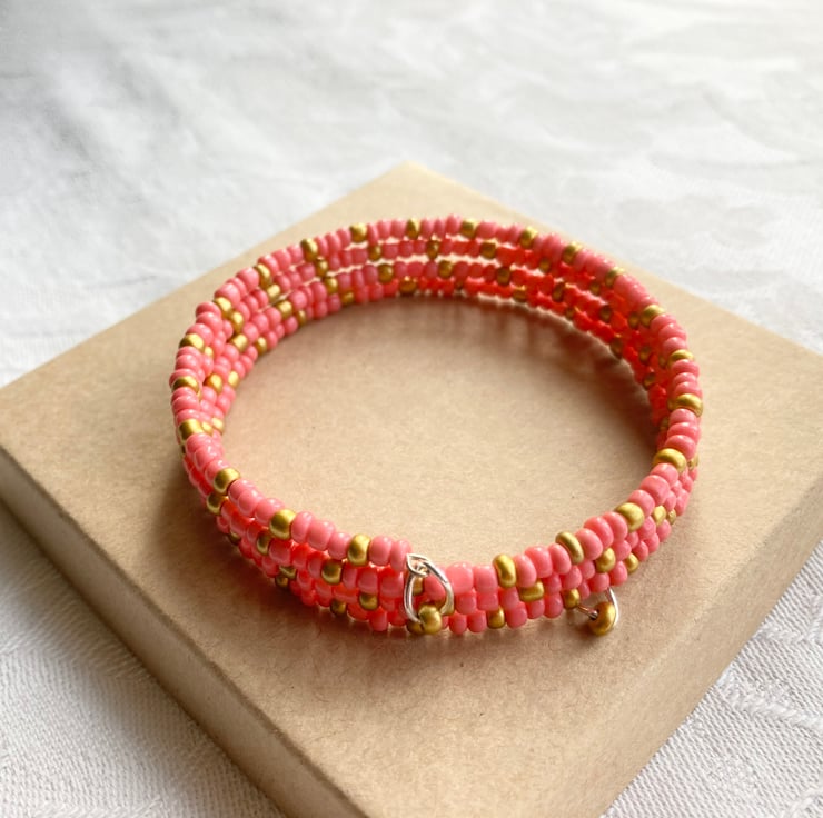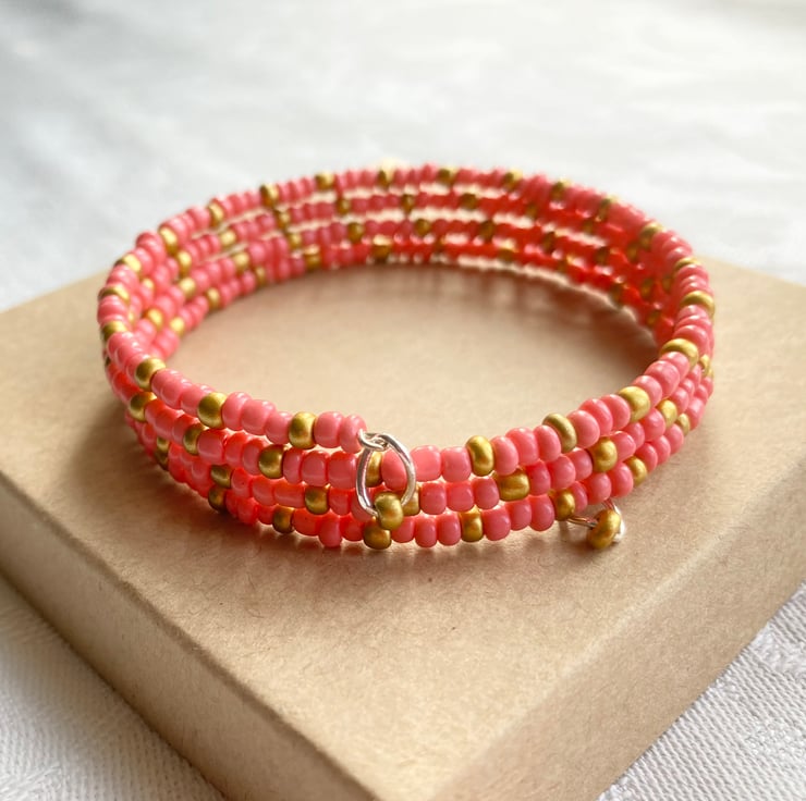 This wrap around bracelet is made with coral and gold coloured seed beads.