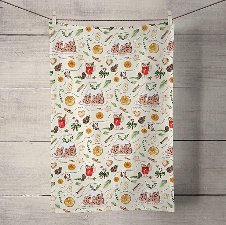 Festive Christmas Organic Cotton Tea Towel: 'Now bring us some figgy pudding'
