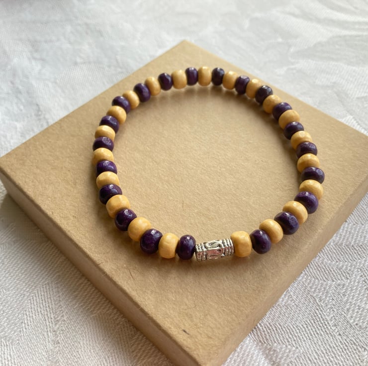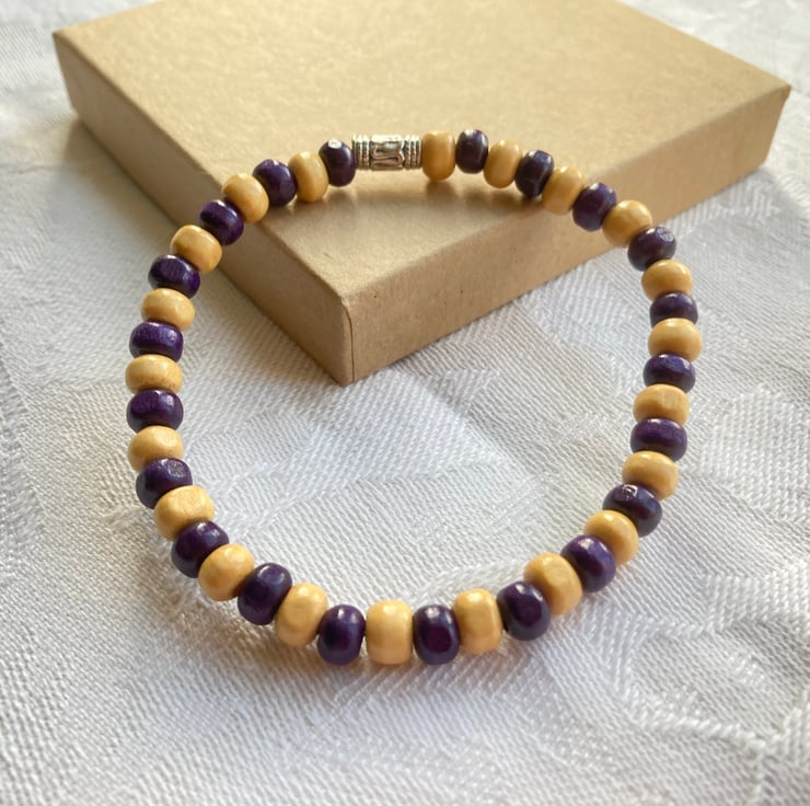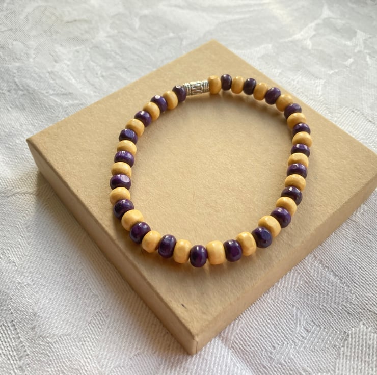 This stretchy bracelet is made with purple and beige wooden beads and a silver plated tribal bead.