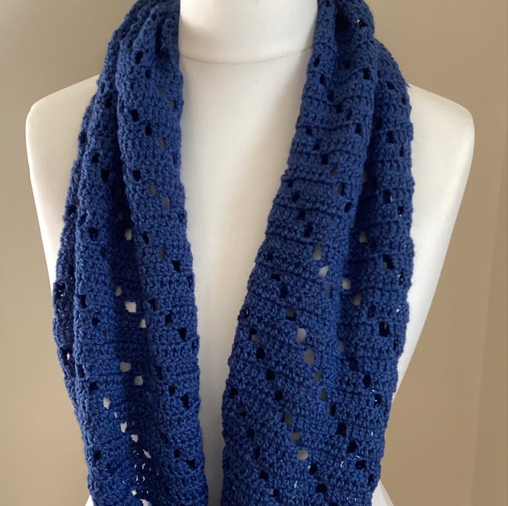 This scarf has been hand crocheted in a soft 4 ply yarn. I have used a loose stitch to give it a contemporary Lacy look.