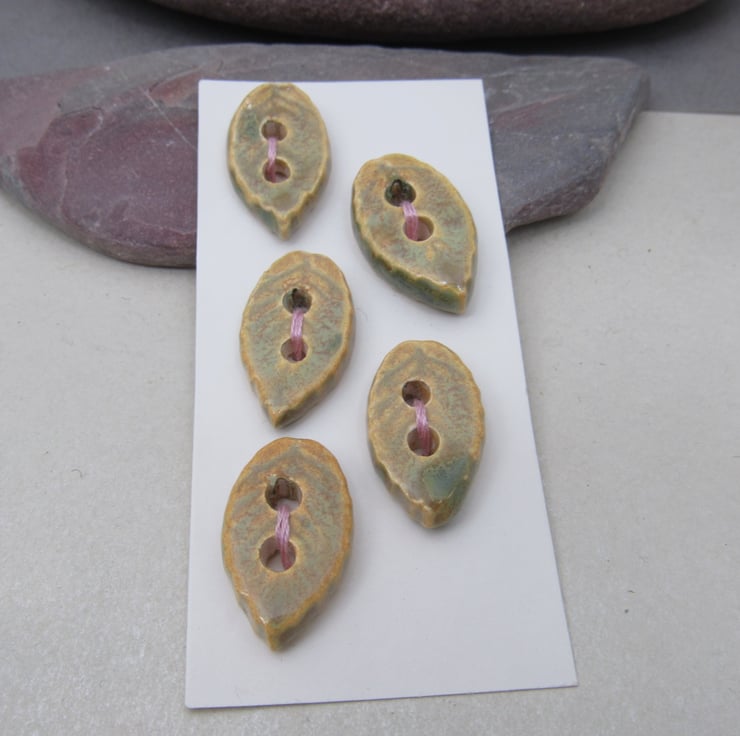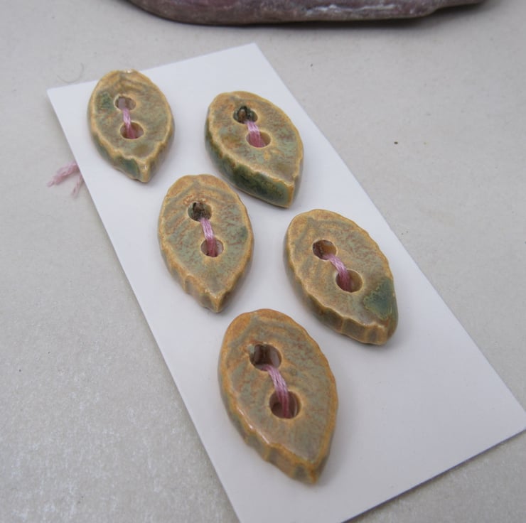 5 small stoneware buttons cut to a toothed leaf shape and finished with a soft golden glaze
