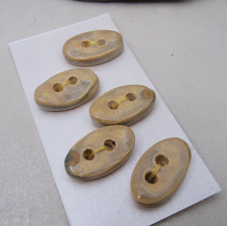 5 small oval stoneware buttons finished with a soft golden green glaze
