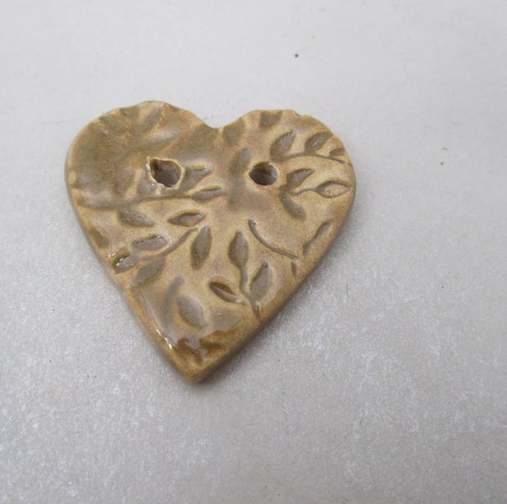 Medium heart shaped stoneware button, textured with a delicate leaf motif.