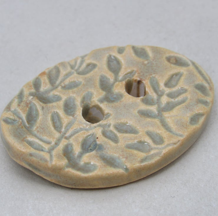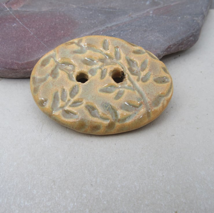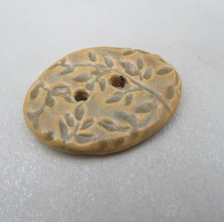 Medium oval shaped stoneware button, textured with a pretty motif of tiny leaves. Finished with a smooth old gold coloured glaze