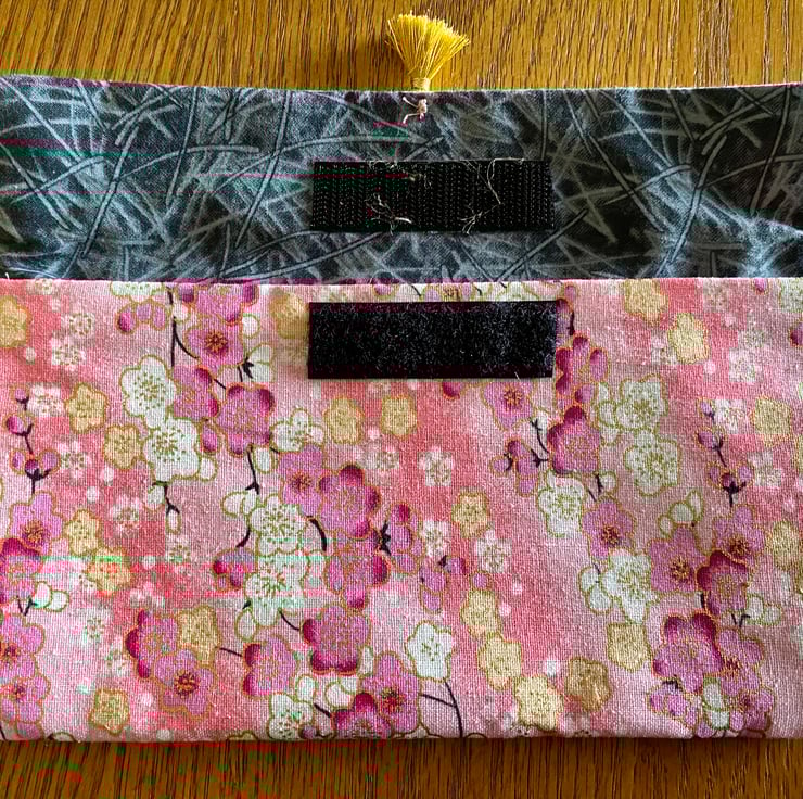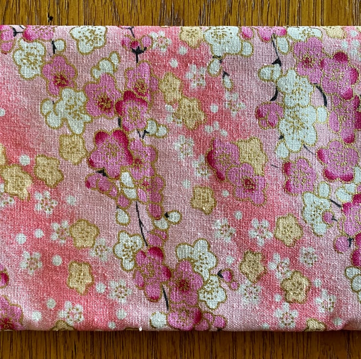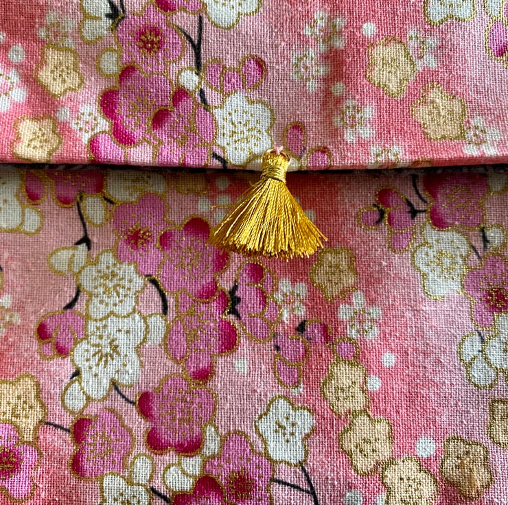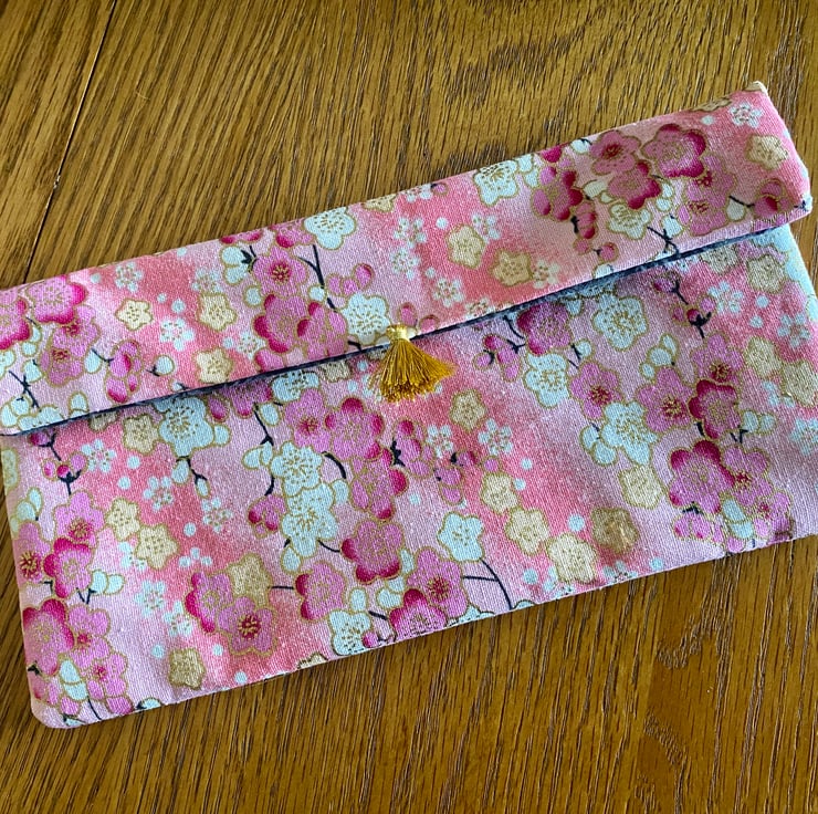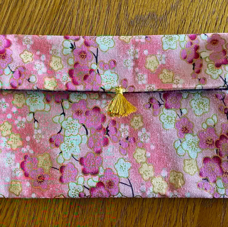 This is a lovely oriental cotton gilded fabric featuring pink apple blossom. It can be used as a small makeup bag, pencil case or phone cover. It measures 22 x 12 cm. The inside is lined with a patterned grey cotton fabric. It is finished off with a small gold tassel. It is sent via Royal mail 2nd class small parcel post, but can be sent 1st class with an extra cost. It will be gift wrapped free as part of the service.