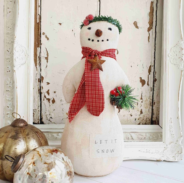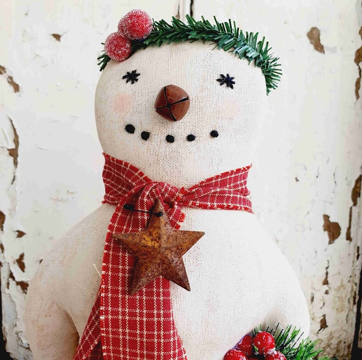 This is a lovely tall primitive style snowman, perfect for your Christmas decor. I age my fabric with coffee, cinnamon and vanilla, once this has been dried I have painted with white acrylic paint to give him an aged appearance. He has been given a dusting of cinnamon to smell all Christmassy and make him look slightly grungy in the American Primitive style. He has a handstitched face and a bell for a nose. He has four bell buttons and a scarf made out of homespun fabric with a rusty star pinned to it. On his head he has a wreath and berries and under his arm he carries a sprig of festive foliage. He stands on his own and is approx. 35 cms tall.
