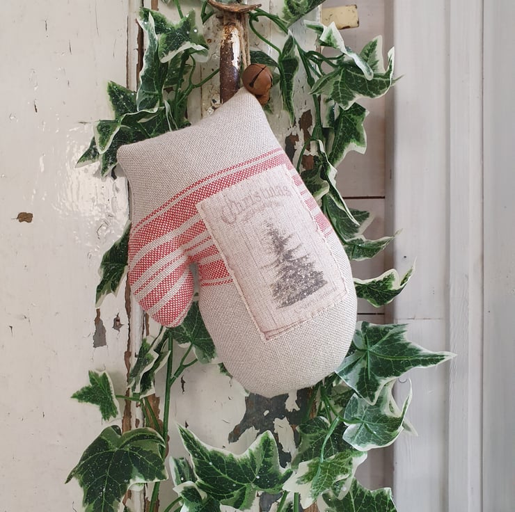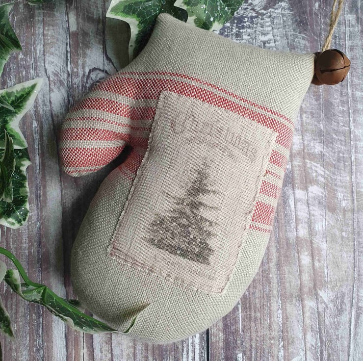 This is a vintage style hanging mitten. It's made out of grainsack fabric and I have sewn a vintage style label to the front. It also has 2 rusty bells attached to the hanger. Great to hang from a peg shelf or on the back of a chair.