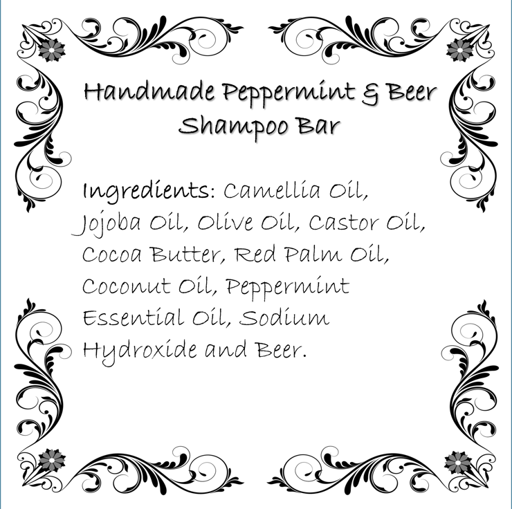 Ingredients: Camellia Oil, Jojoba Oil, Olive Oil, Castor Oil, Cocoa Butter, Red Palm Oil, Coconut Oil, Peppermint Essential Oil, Sodium Hydroxide and Beer.
