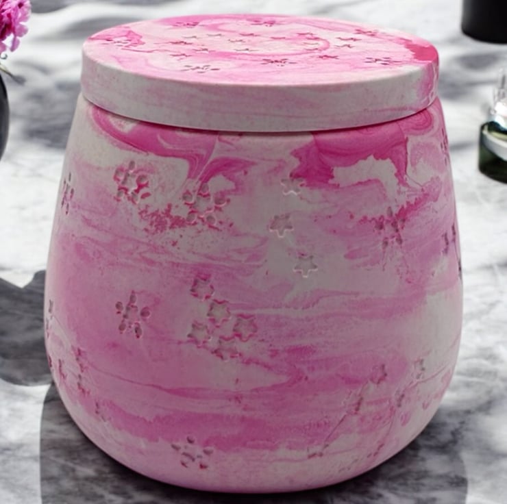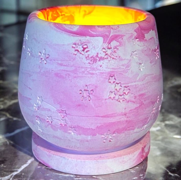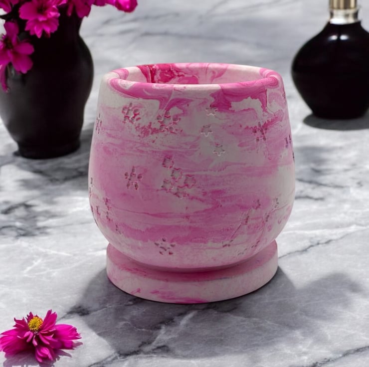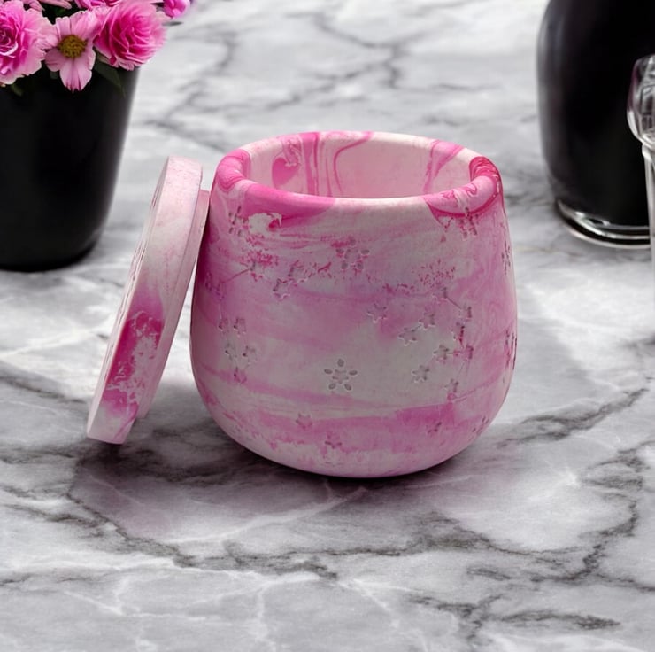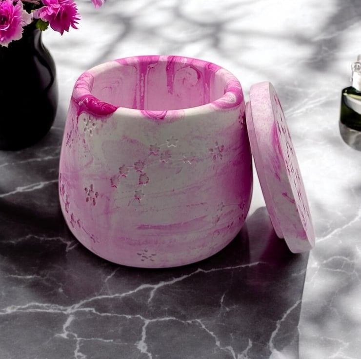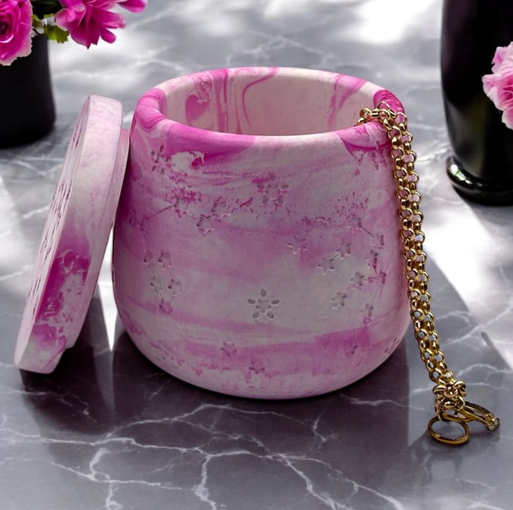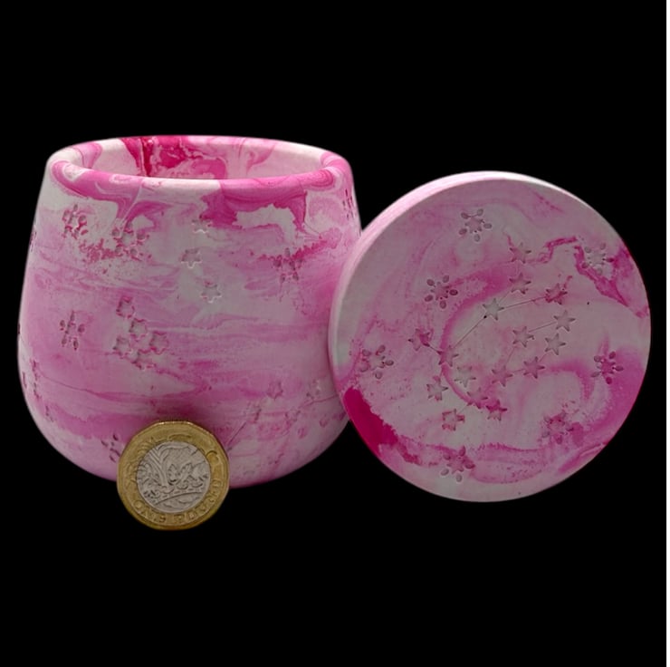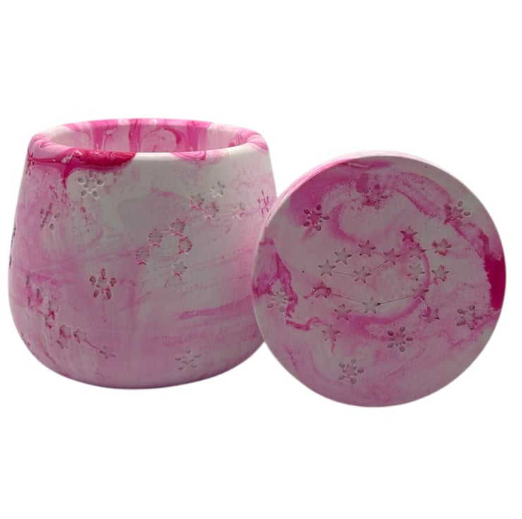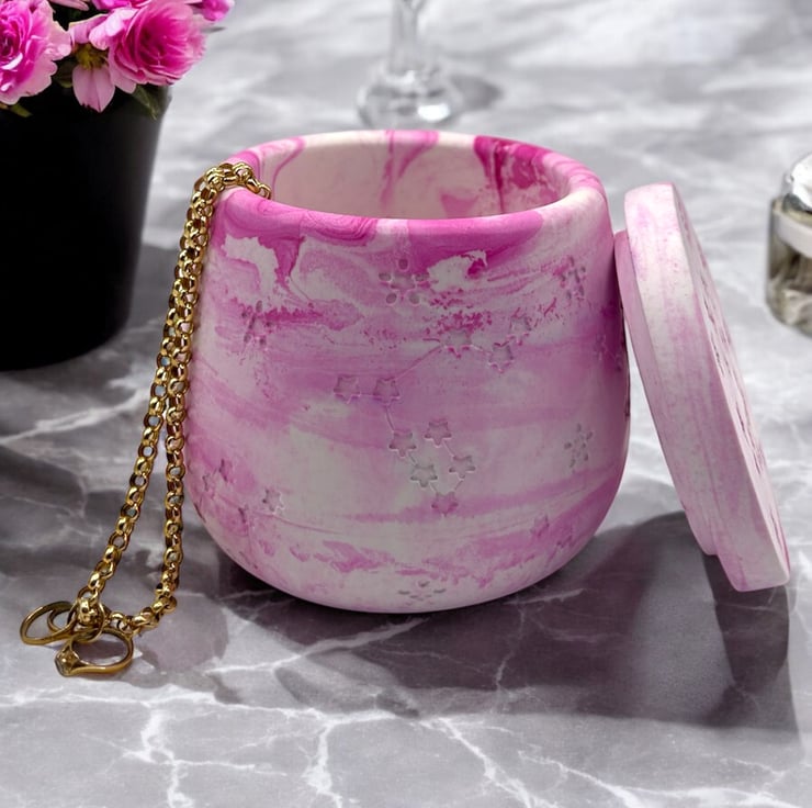 Inspired by the timeless elegance of marble, this star and constellation-adorned jewellery box is crafted from premium British plaster. With a dense, smooth, luxurious finish similar to marble, and a lovely weighty feel. It is perfect for storing your keepsakes, trinkets, jewellery or small treasures. It can also be used as a candle jar to hold tealights or small pillar candles, the lid can then be repurposed as a coaster to protect your surfaces from heat. The beautiful pink marbling effect on this unique trinket pot makes each one a unique piece of art making it an ideal gift for a special person or as a treat for yourself.