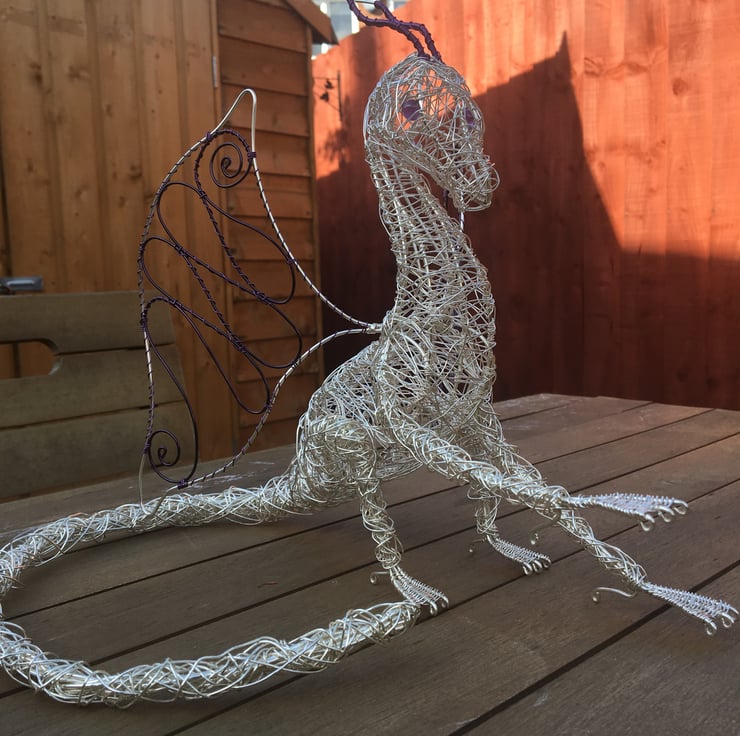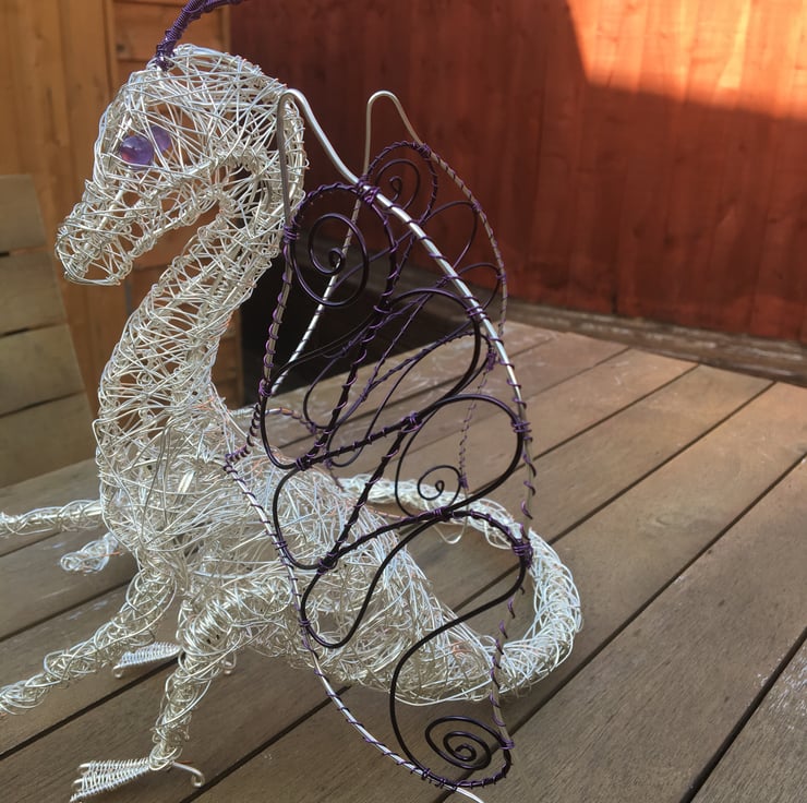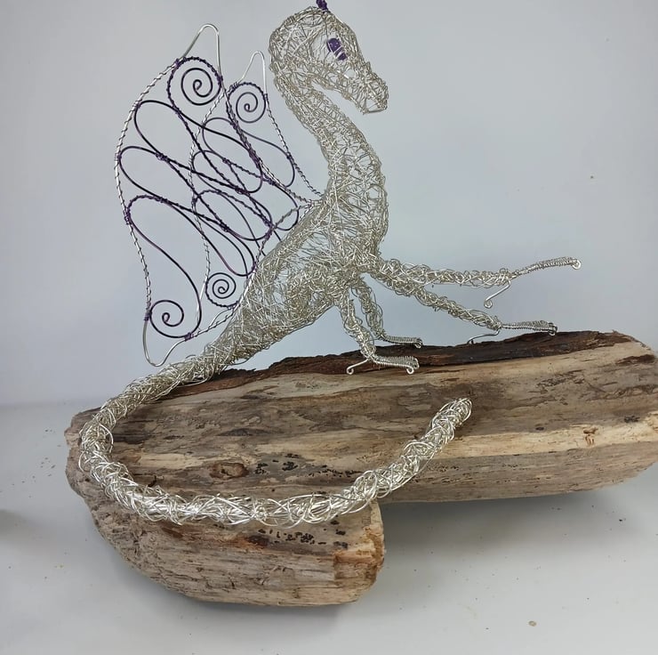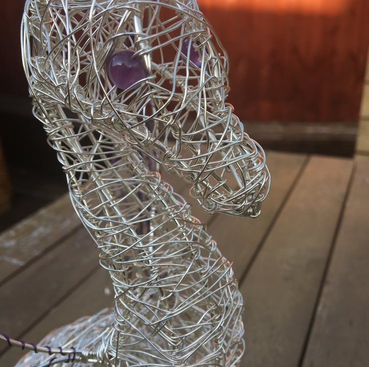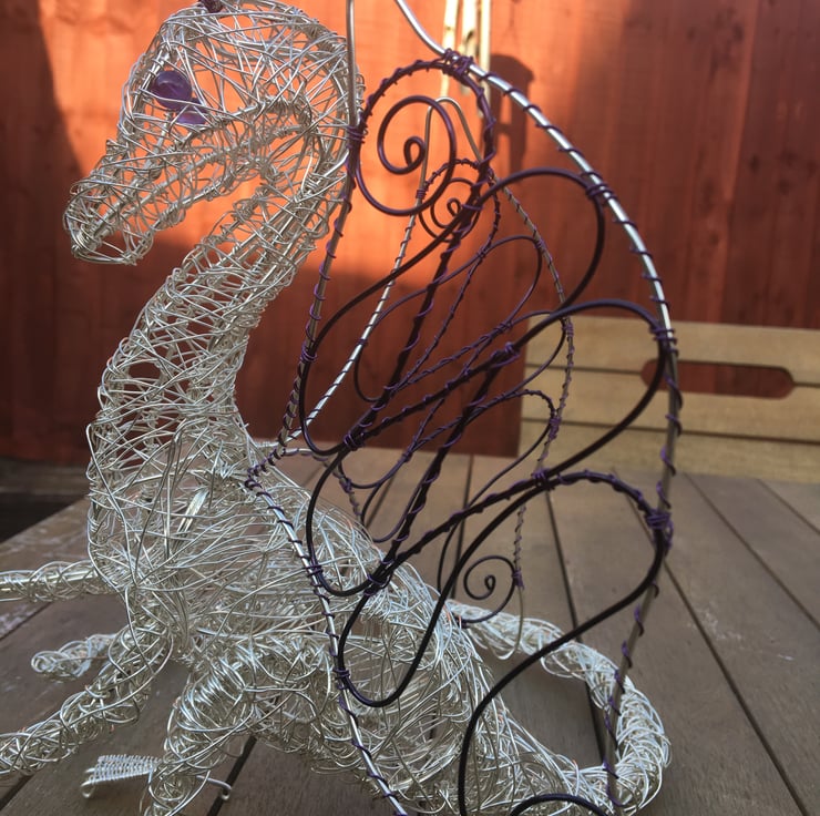 This dragon sculpture is skillfully crafted using silver-tone and purple wire, accented with captivating amethyst eyes. It is a freestanding piece, perfect for display. (Please keep in mind that the wooden base shown in the photos is for display only and is not included with the sculpture.)