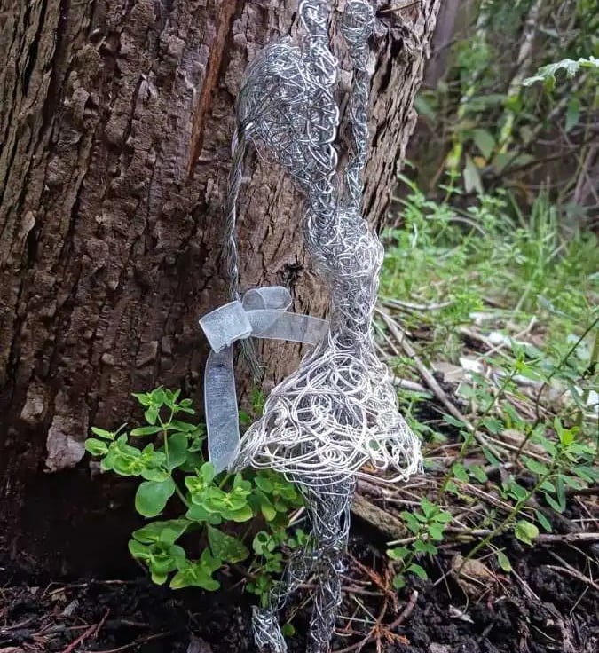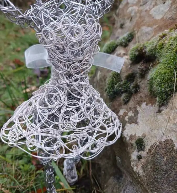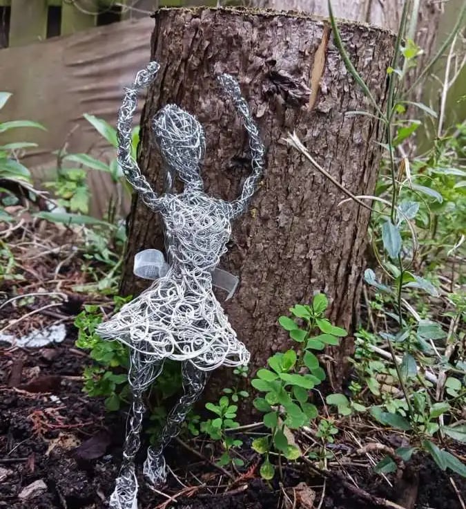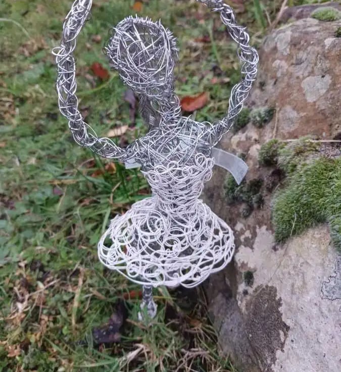 This enchanting ballerina sculpture is delicately handcrafted from stainless steel wire, adorned with a colourful wire dress, and features elegantly plaited long hair finished with a charming bow. Measuring approximately 10 inches tall, this hanging sculpture gives the appearance of a dancer gracefully performing in mid-air. A truly captivating piece, it is perfect for creating a sense of movement and artistry in your space.