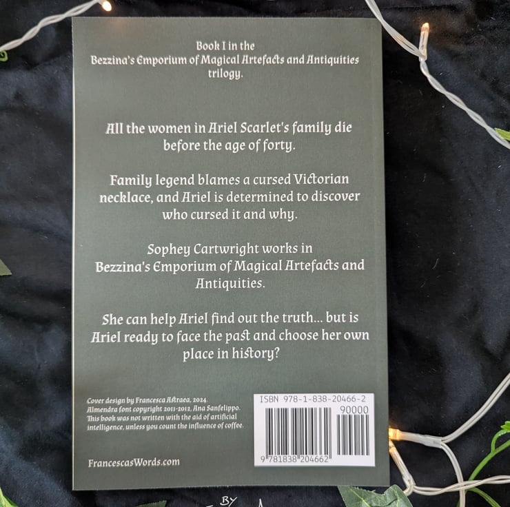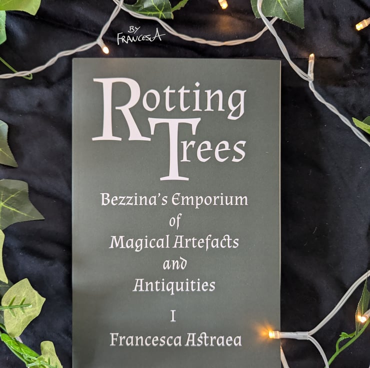 ROTTING TREES is a young adult fantasy novel about a teenage girl with a cursed family necklace and the magical antiques shop she visits to try to break the curse. You can learn more about it by visiting my website, FrancescasWords.com, and searching 'Rotting Trees' or following the links. You can find merchandise bundles (pictured, not included) in my shop.