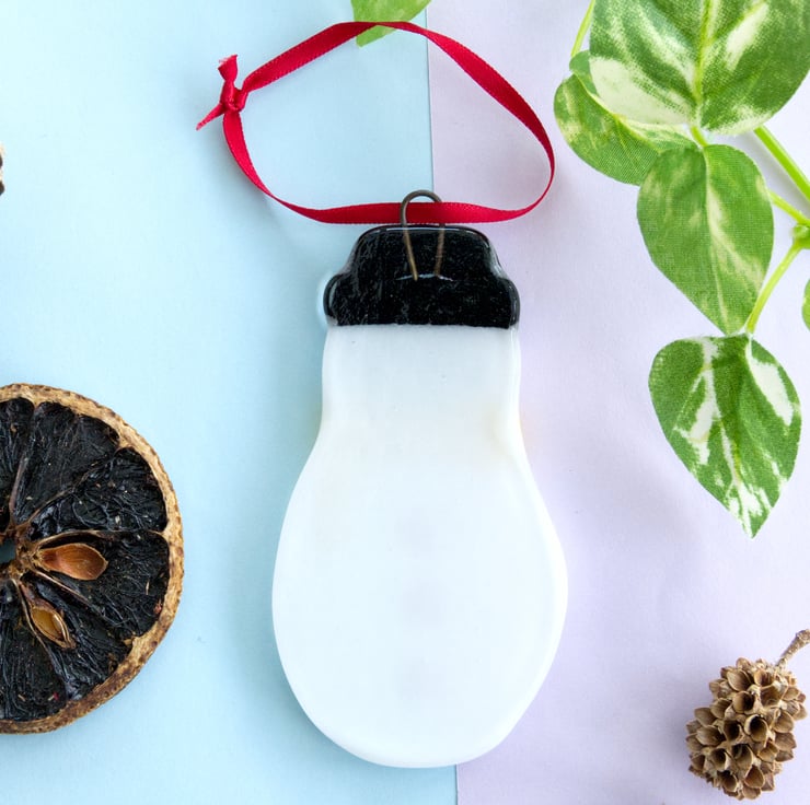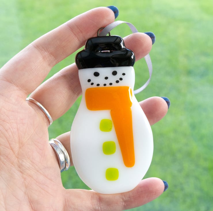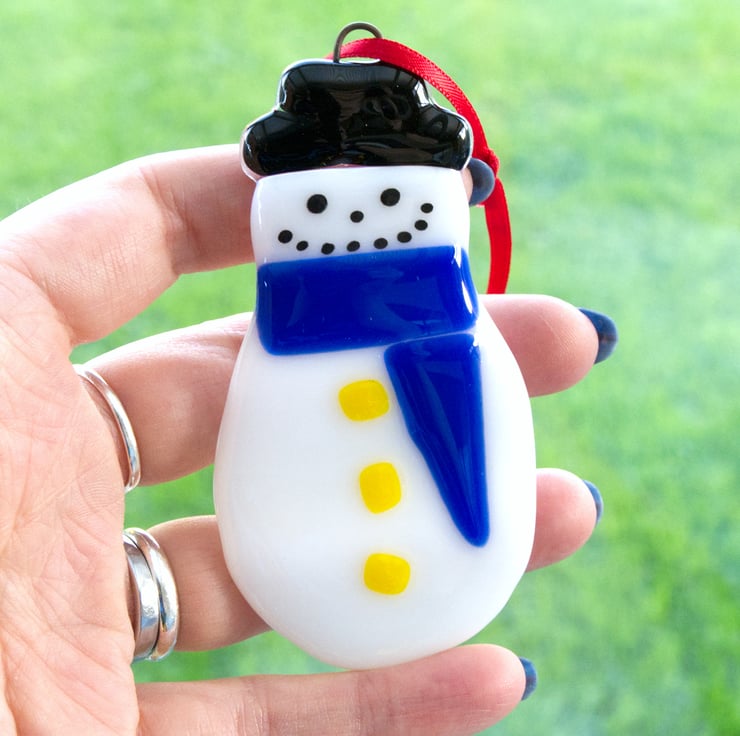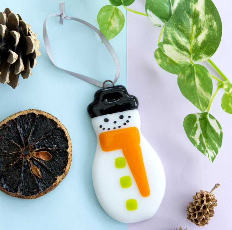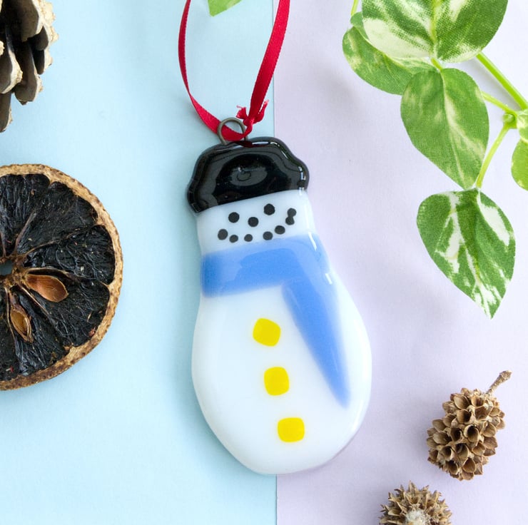 Quirky fused glass snowmen Christmas tree decorations. Each one has been cut by hand, assembled and hand painted before being put in the kiln for around 12 hours. They all come with a ribbon ready to hang on your Christmas tree.