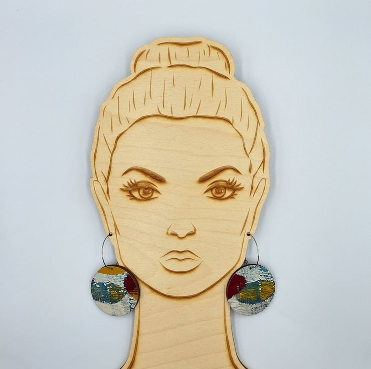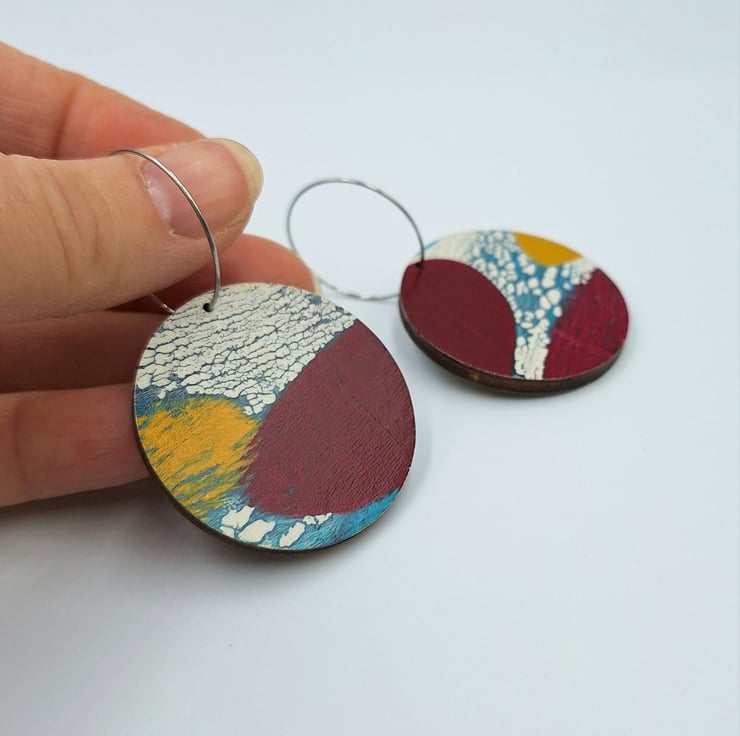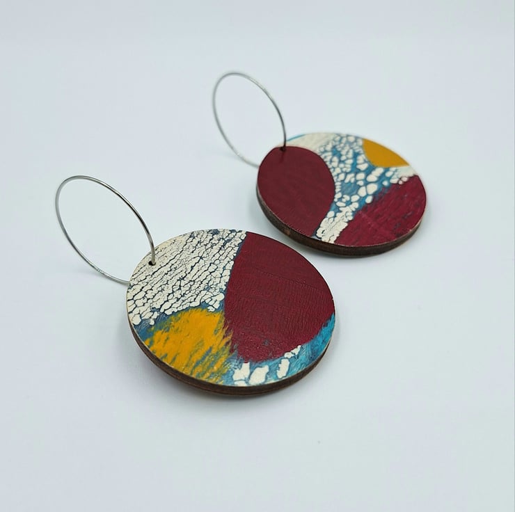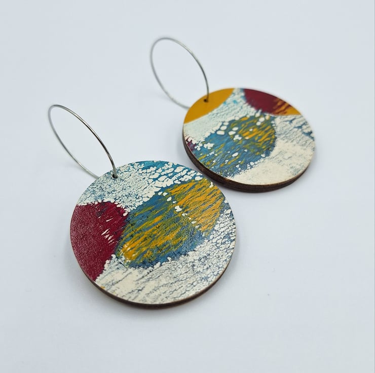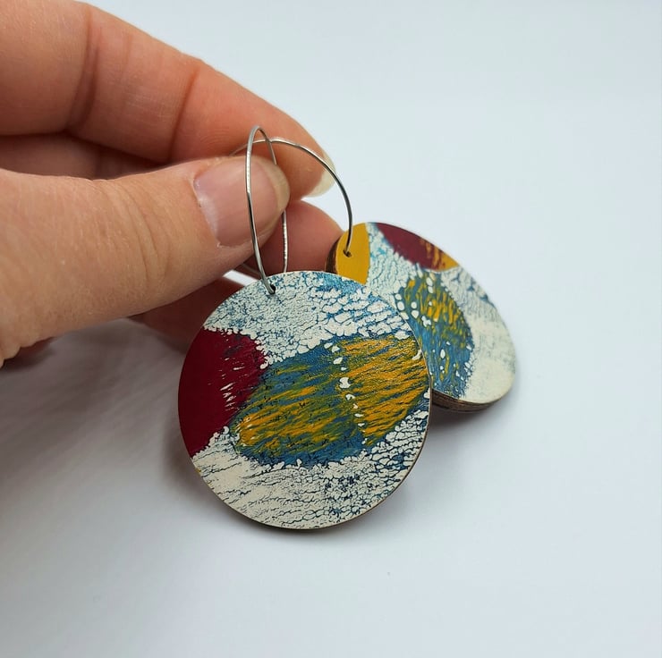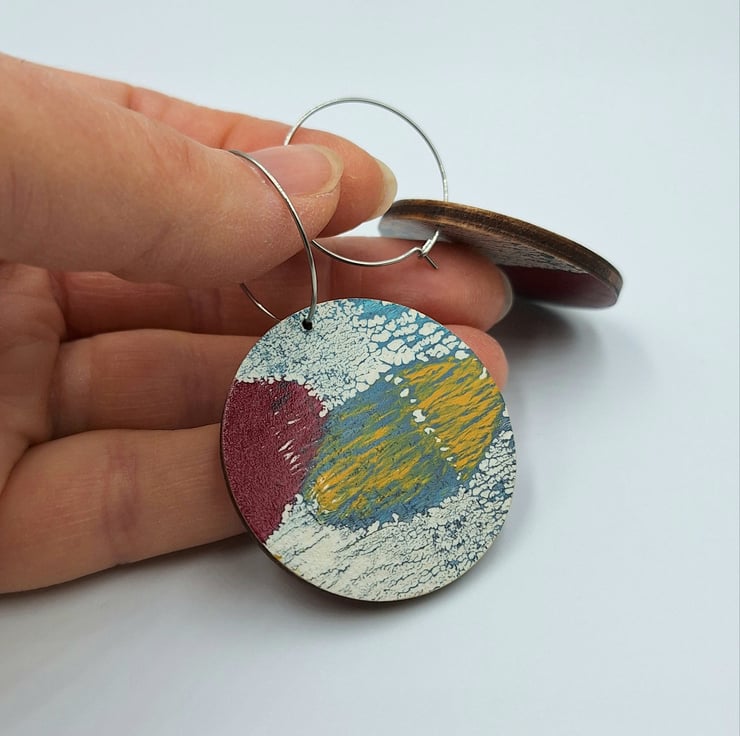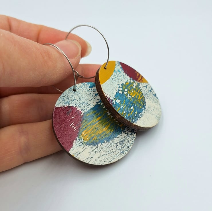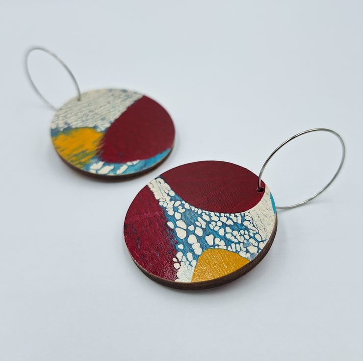 Hand printed patterned earrings which are reversible, two pairs for one! The stainless steel hoop can easily be turned around.