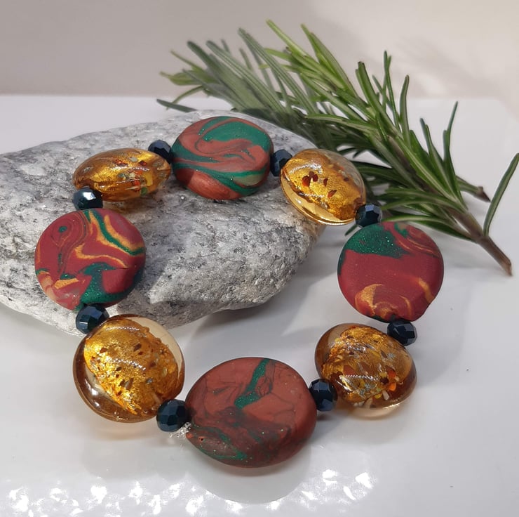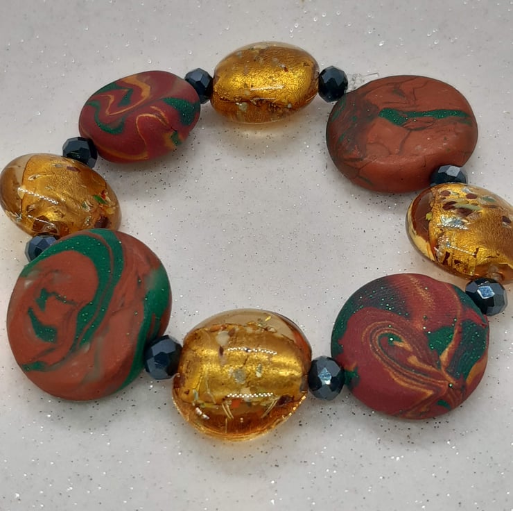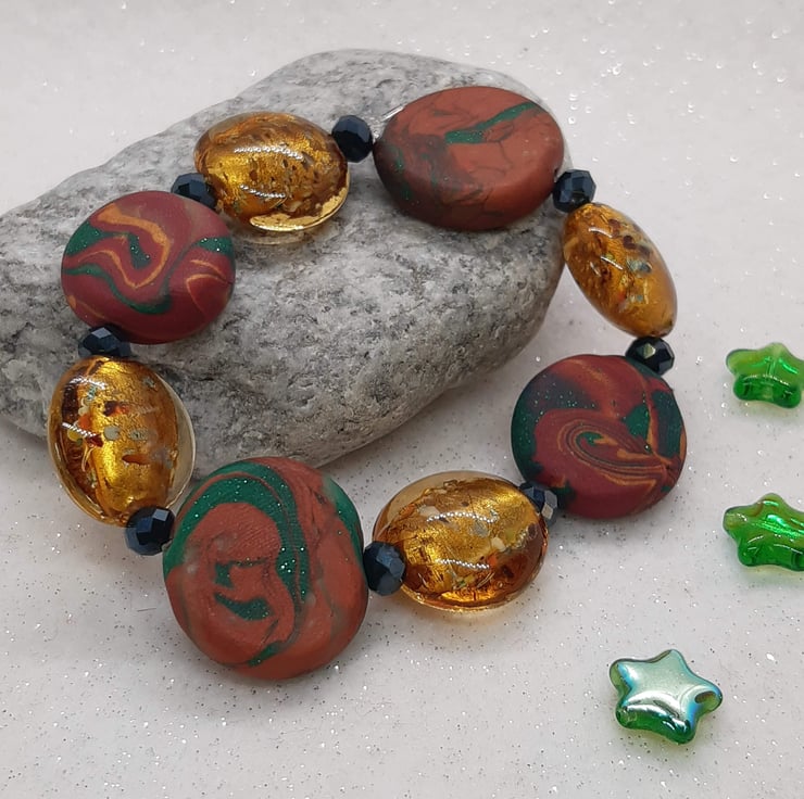 This bracelet features handmade disc shaped beads in a unique swirl design of copper, brick red, green and gold polymer clay with a hint of sparkle.