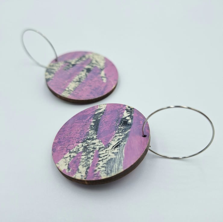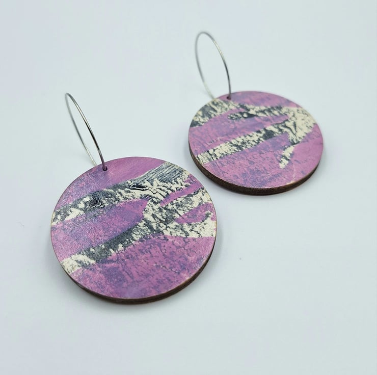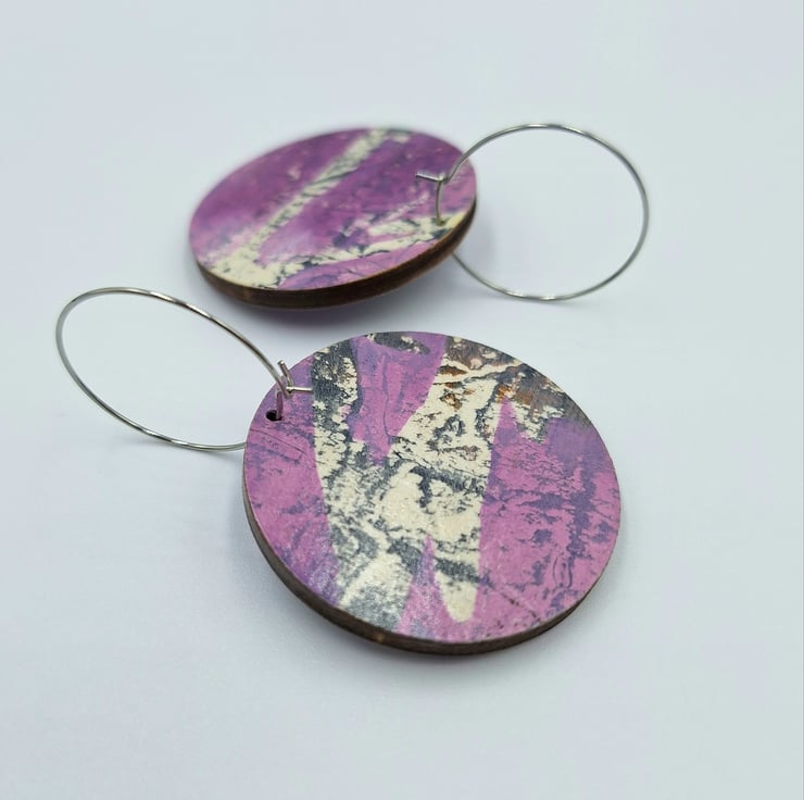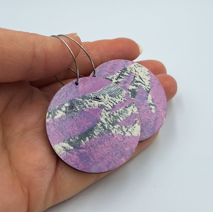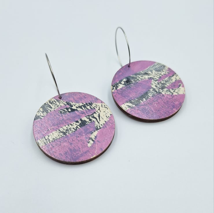 Funky abstract pink, grey and white hand printed earrings. These are light to wear and unique to you!