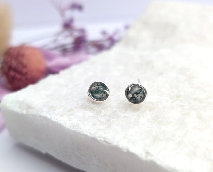 Delicate handmade ear studs featuring moss agate natural gemstone beads. Designed with a minimalist touch, these are simple lightweight studs that are perfect for wearing everyday. Available in sterling Silver of 14K Gold Filled. Each bead has a unique moss like pattern inside, and can range from translucent in colour to a darker green. These dainty earring studs would make a lovely gift for yourself or a loved one.