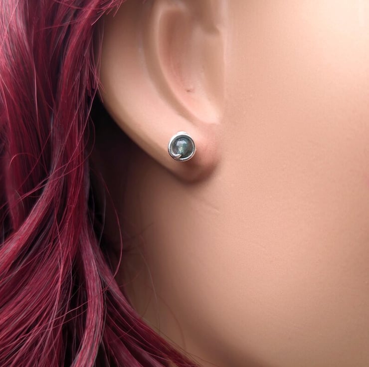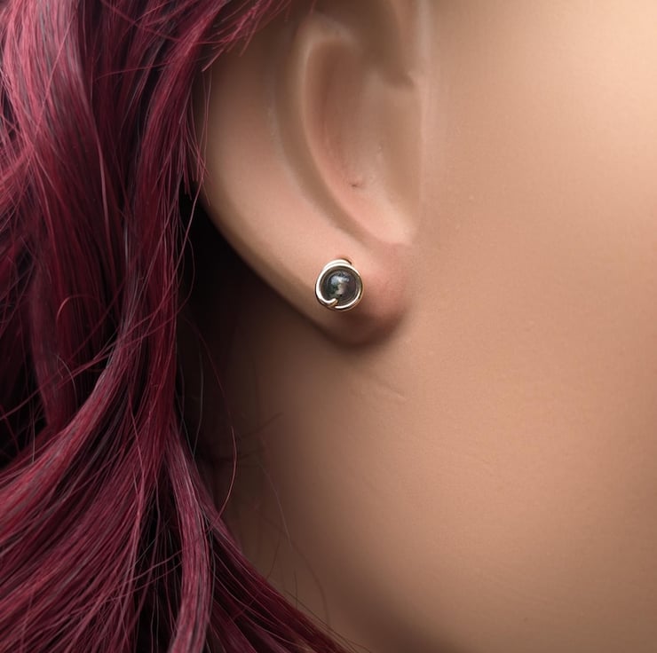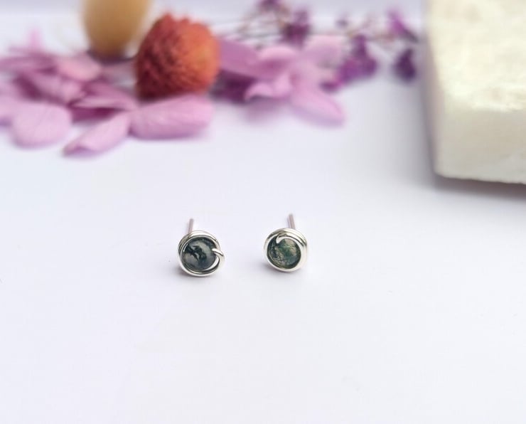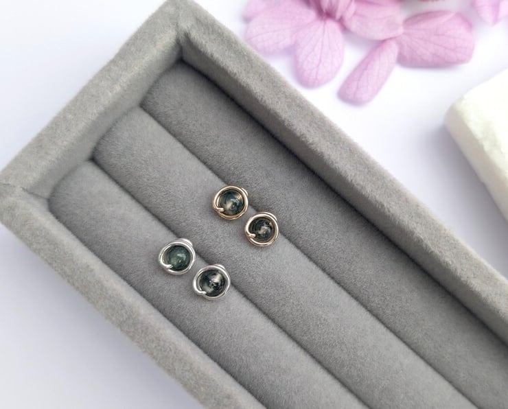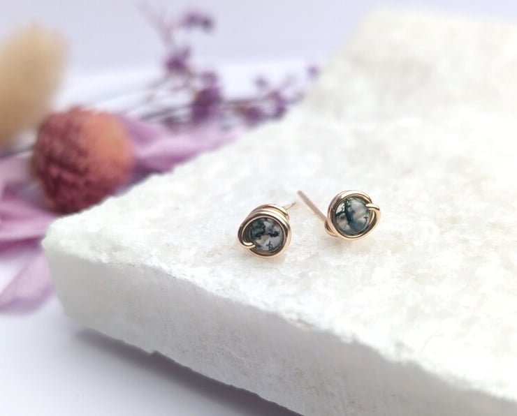 Delicate handmade ear studs featuring moss agate natural gemstone beads. Designed with a minimalist touch, these are simple lightweight studs that are perfect for wearing everyday. Available in sterling Silver of 14K Gold Filled. Each bead has a unique moss like pattern inside, and can range from translucent in colour to a darker green. These dainty earring studs would make a lovely gift for yourself or a loved one.