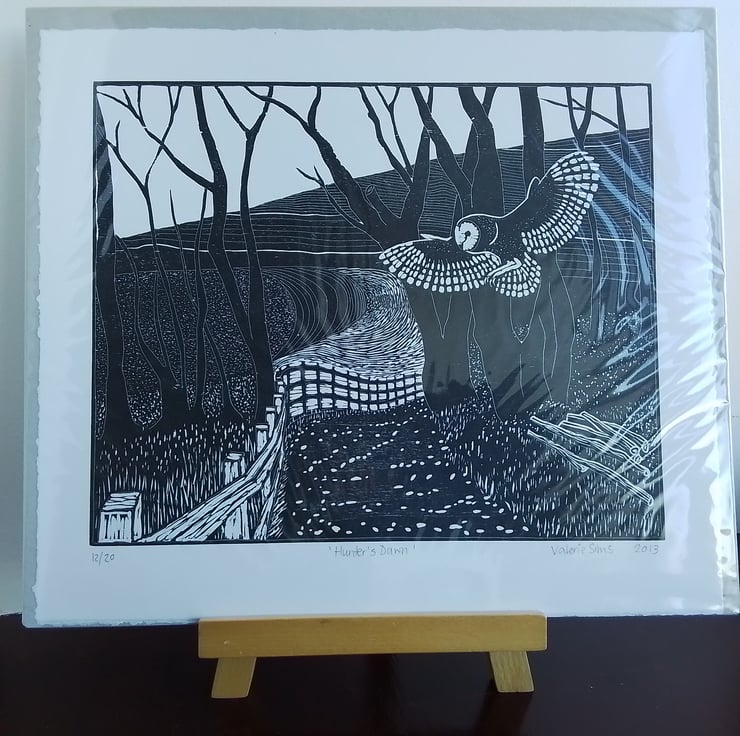 Woodcuts are sold unframed and sent in a card-backed clear protective sleeve, packaged with more cardboard