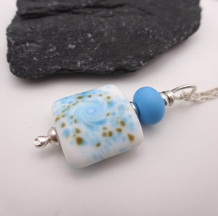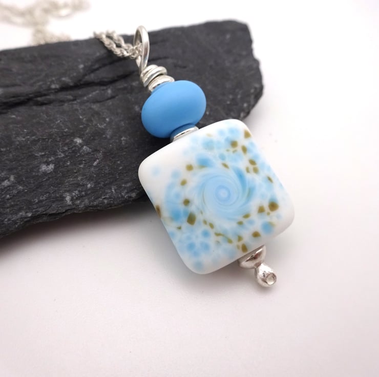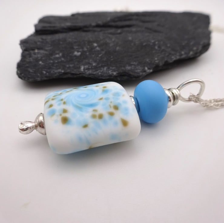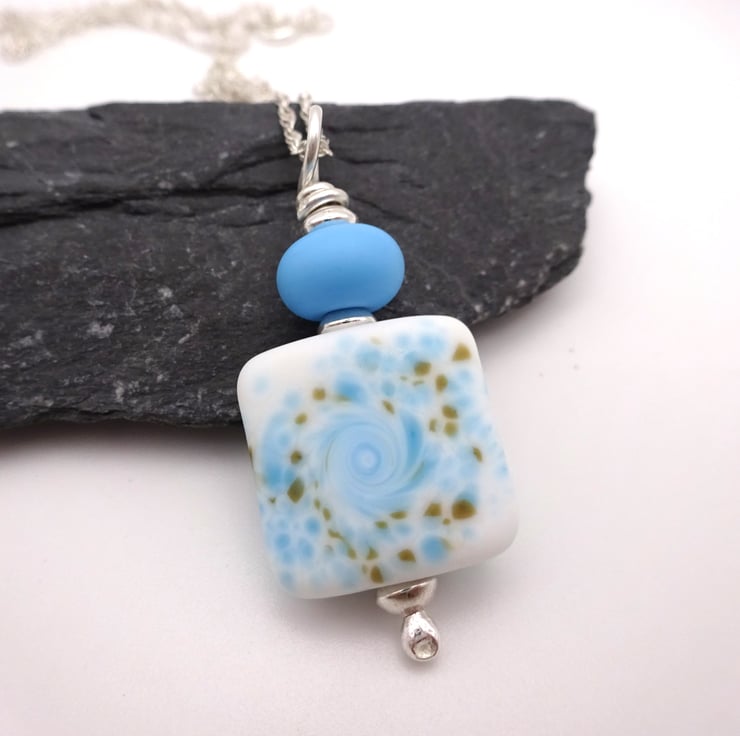 A sterling silver chain strung with a handmade lampwork glass pendant.