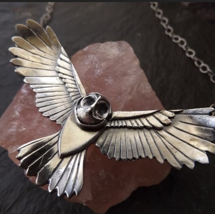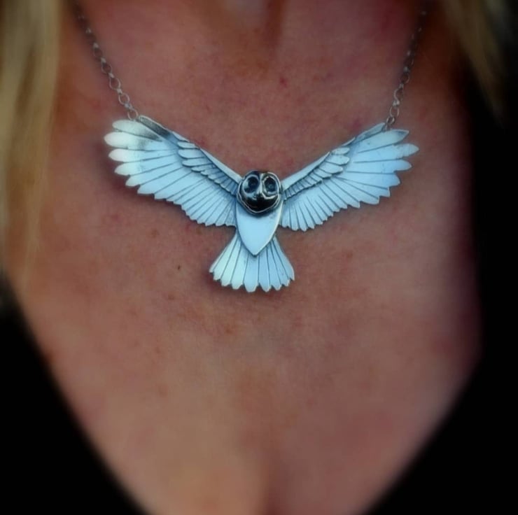A silver owl necklace , totally handmade and formed from sterling silver , with a lifelike face and outspread wings . The owl has been hand sawn , and layers added to form its body and wings , the necklace is attached to a fine belcher chain , which has been oxidized and brushed for a more rustic feel