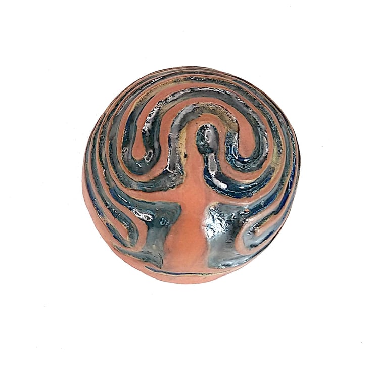 This handmade labyrinth is double-sided, each side designed to take you on a journey clock or anticlockwise. Fitting snugly in the hand you can trace the flat side of the labyrinth or if placed on a table, on its flat side, you gain access to the spherical labyrinth for the up and downhill “walk”.
