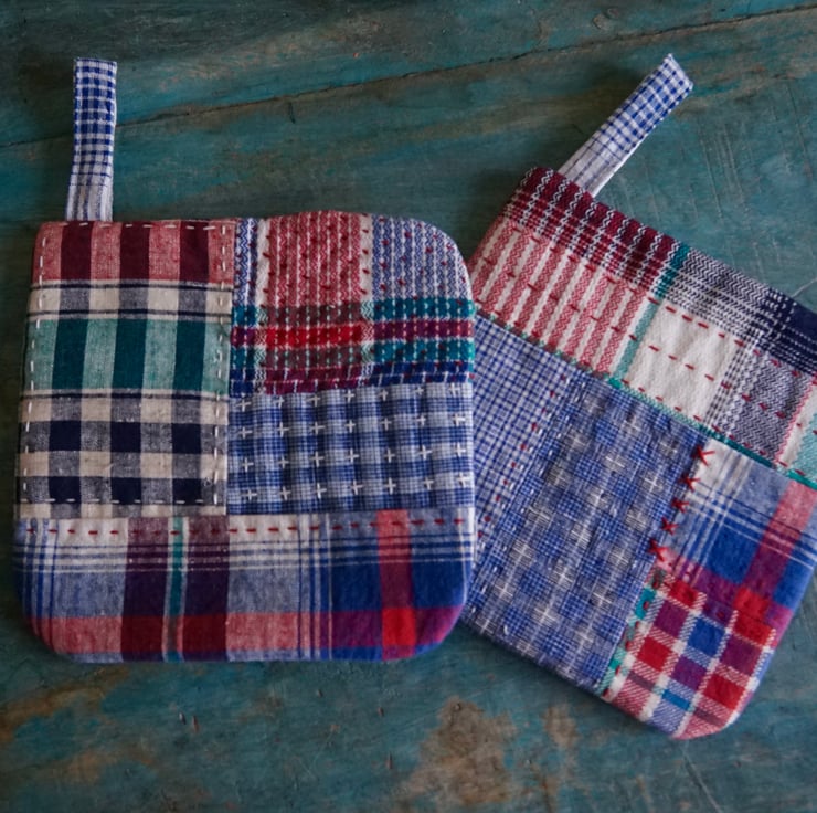 Bring a touch of joy and warmth to your kitchen with this patchwork pot holder. Crafted from vintage Chinese cotton fabrics in various styles, it features a charming blend of textures and colours. With a layer of heat-resistant batting inside, this 17cmW x 17cmH pot holder is perfect for handling hot pots, pans and lids. Its unique patchwork design and hand stitched details make it a standout gift or a practical addition to your home. Handmade with care, it reflects an eco-conscious approach to crafting, celebrating the beauty of vintage materials.
