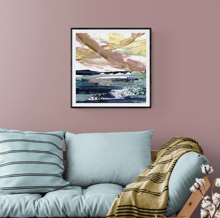 Art print of acrylic, semi-abstract seascape inspired by the stunning transition from late summer to autumn, as the colours turn to beautiful pinks, reds and oranges.