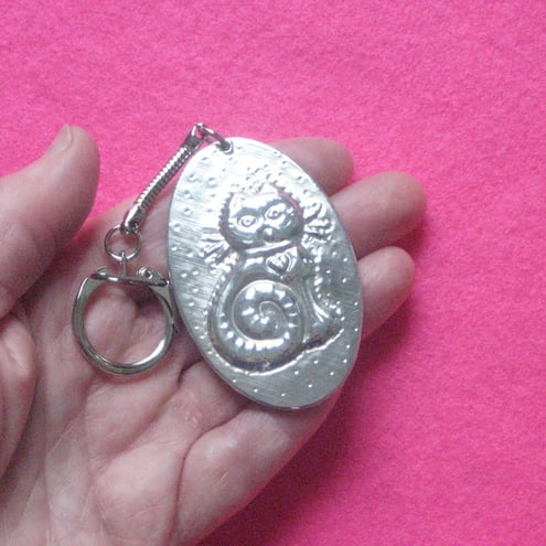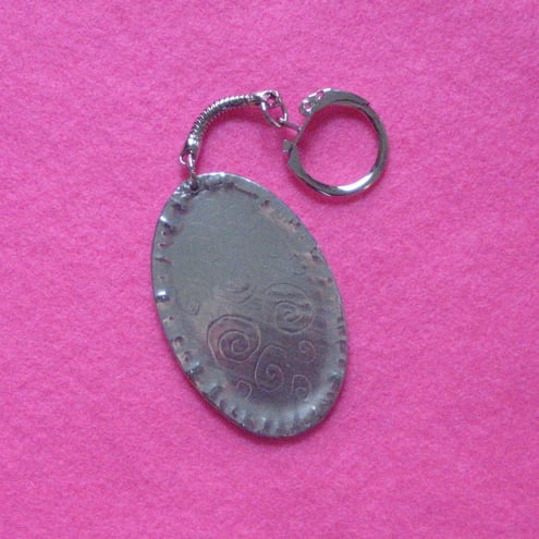 This keyring has been hand-made in shiny modern pewter. (The design has been raised on a piece of sheet pewter, the raised area has been filled,then mounted on a rigid base) The oval measures 60 x 37mm,and is light in weight.