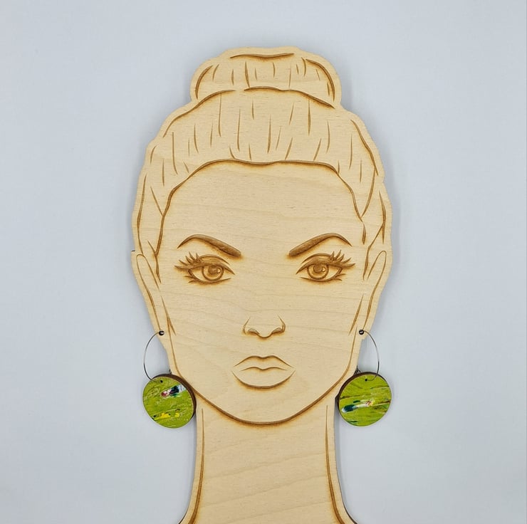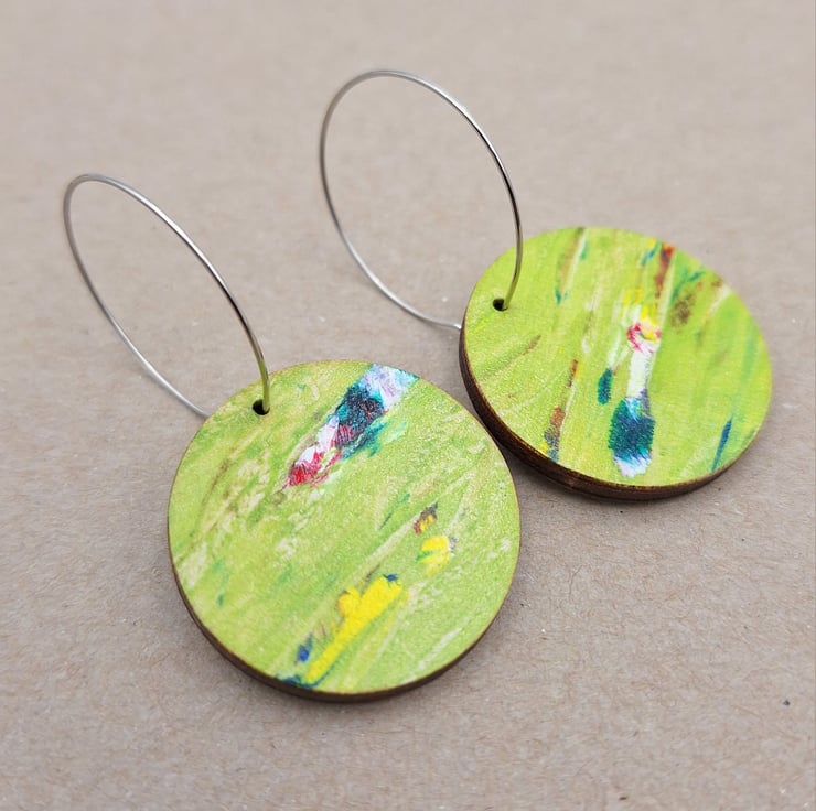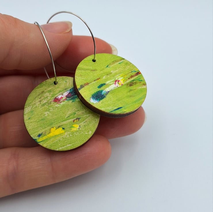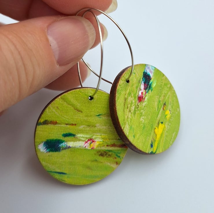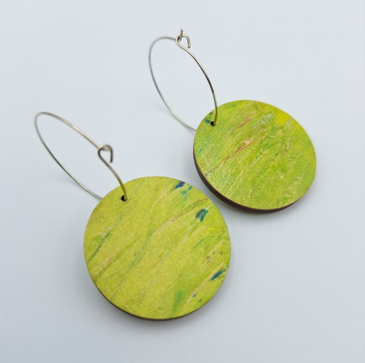 Lime green wooden disc earrings with flashes of red, pink, white, yellow and green. These earrings are small and made from a hand printed wooden disc and finished off with a silver plated hoop.