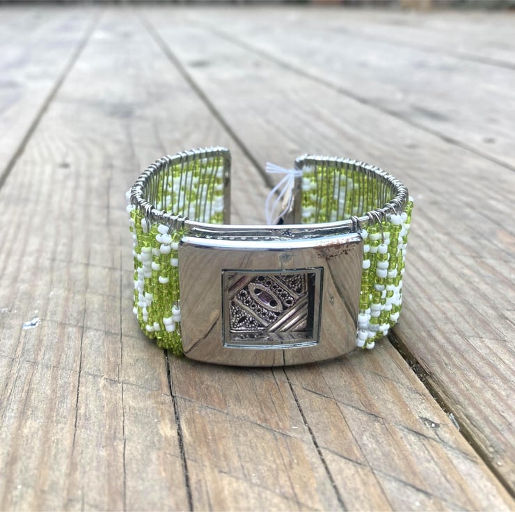 Upcycled Lime Green Seed Beads Handmade Bangle Featured With A Filigree Charm