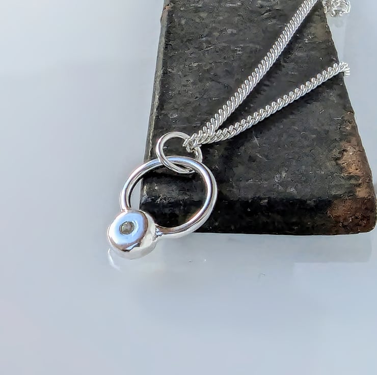 A little pendant, made from recycled sterling silver melted into a ball and hammered flat this gives a beautiful uneven and organic pebble design set within a hoop.