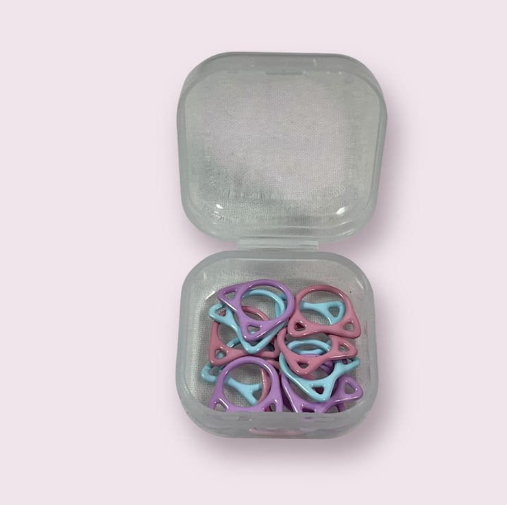 Set of 12 4 each of rose Pink, baby blue and lilac Fits comfortably up to 7mm (approx US 10) needles.