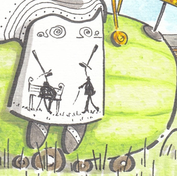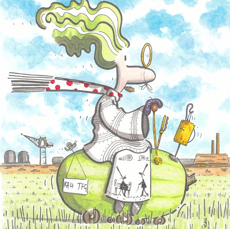 Joan, who is the aunt of Felicity (see The Ballerina) splits her time between her allotment and an old lock up shed, where she invents things. The Melon Car came about as a result of an excess of melons on the allotment. It has 4 gears, no reverse and a top speed of 'Not Very Fast' . It is NOT licenced or roadworthy but as Joan only uses it on private land it doesn't need to be. If you want to build your own melon car Joan will let you have a copy of the plans for free.