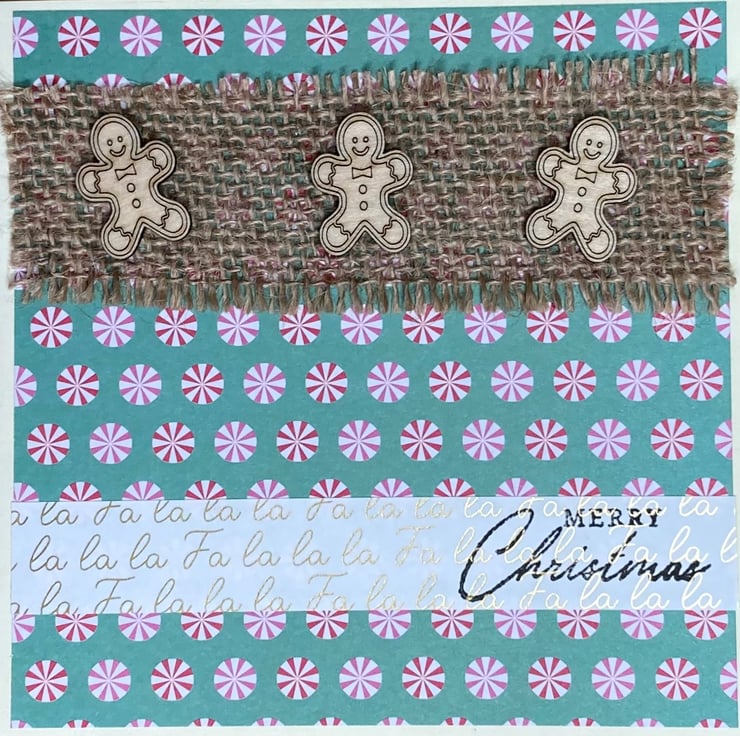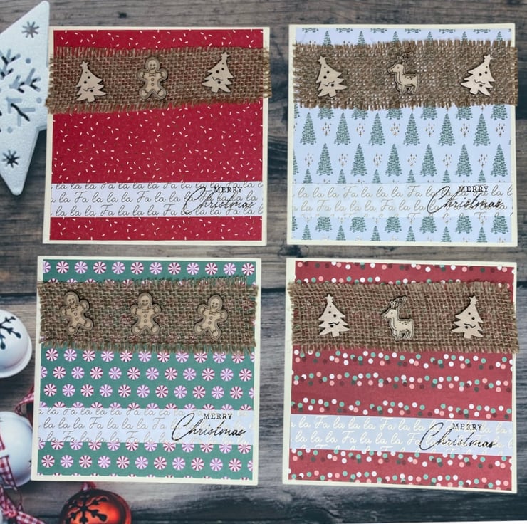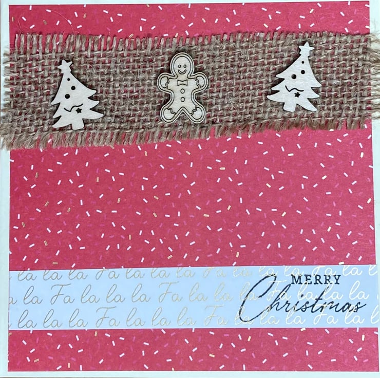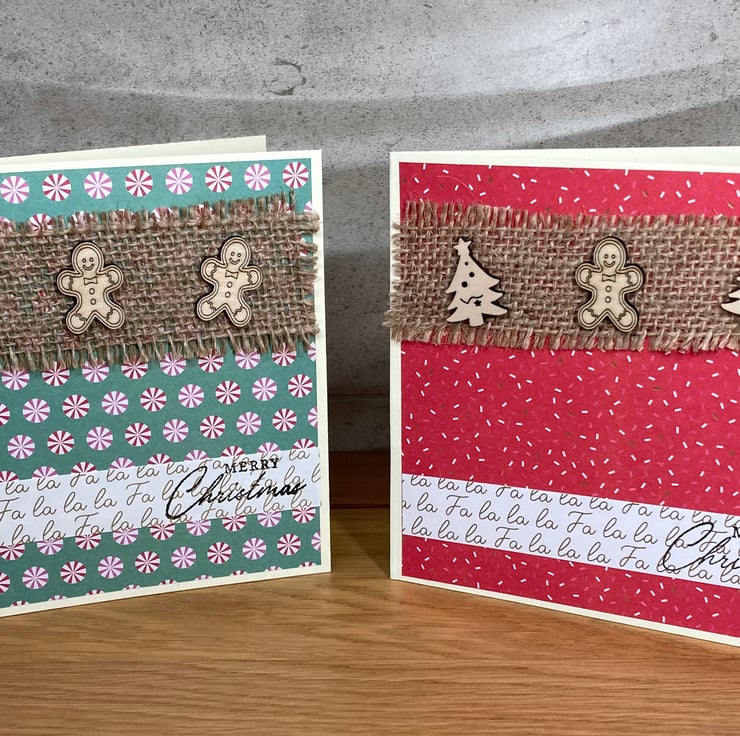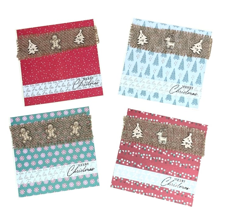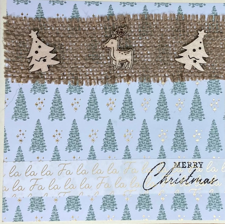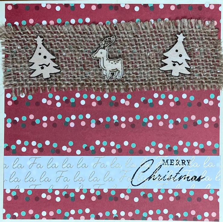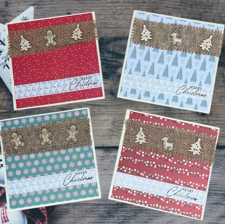 These 5 x 5 inch cards have a cream card base which has been layered with festive paper. A layer of hessian has been added providing a touch of rustic charm. Little wooden embellishments have been added, these are made by us and have been laser engraved and cut out.
