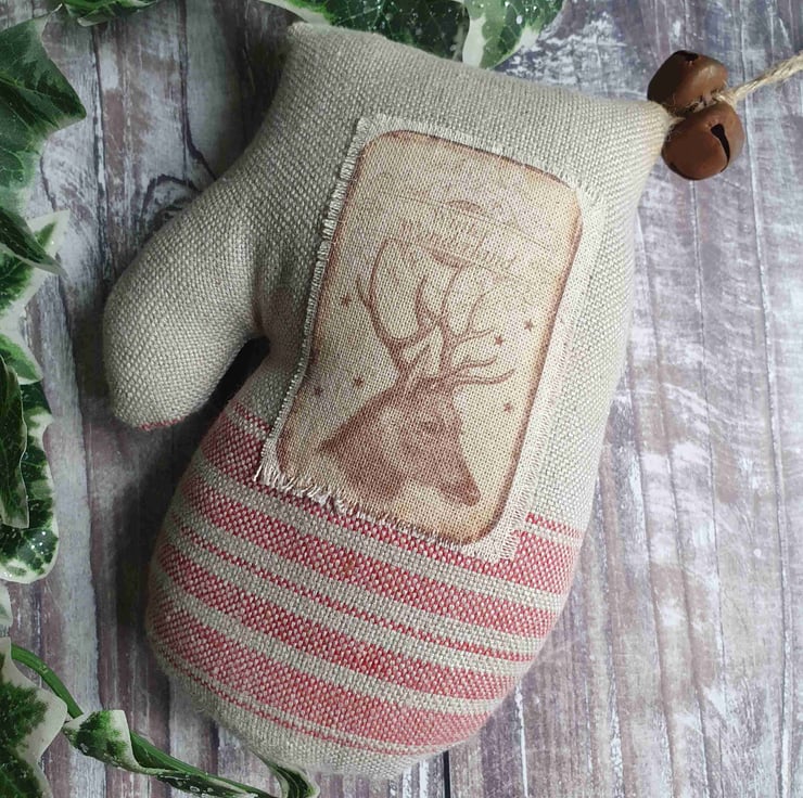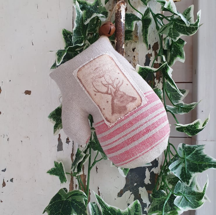 This is a vintage style hanging mitten. It's made out of grainsack fabric and I have sewn a rustic vintage style label to the front. It also has 2 rusty bells attached to the hanger. Great to hang from a peg shelf or on the back of a chair.