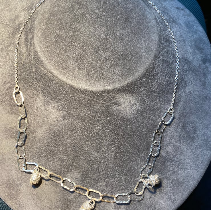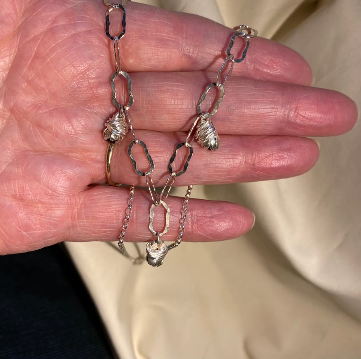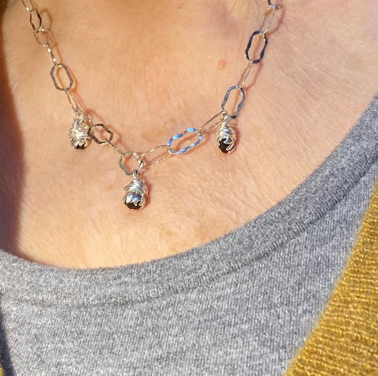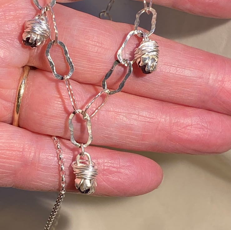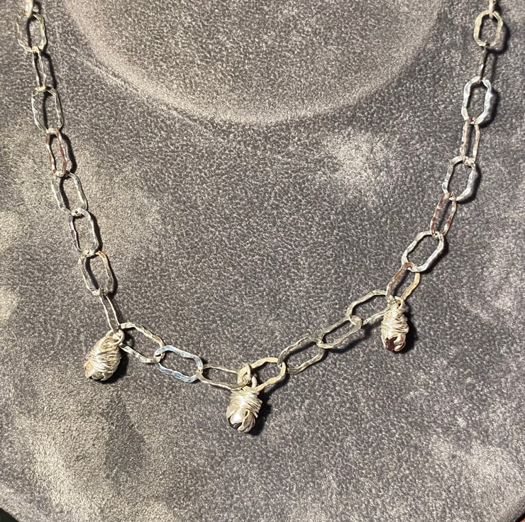 3 Thames garnet buds hang from a bright Sterling silver 2 thickness chain with a bolt ring fastening. Pretty, light and flattering. The necklace measures 19inches. Dispatched boxed and with an anti tarnish storage bag.