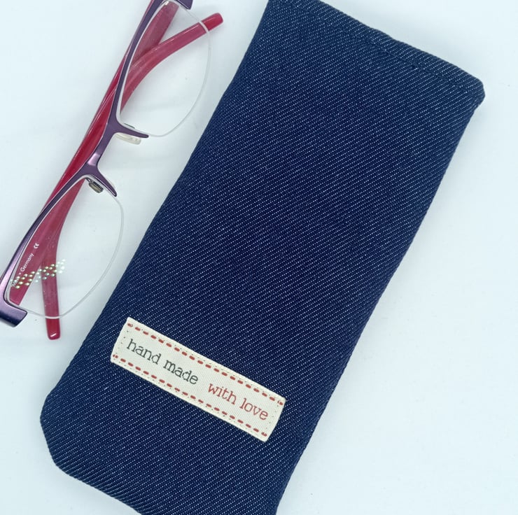 It is wadded to protect your glasses and features a handmade with love label on the back. Lining is in pale blue spotted cotton.