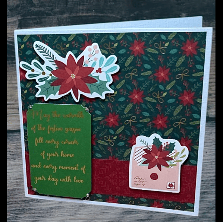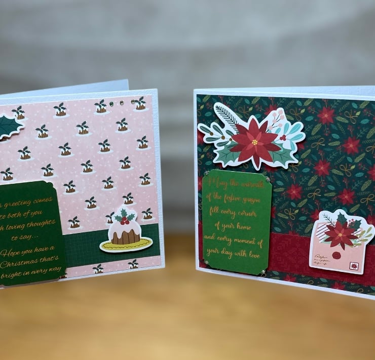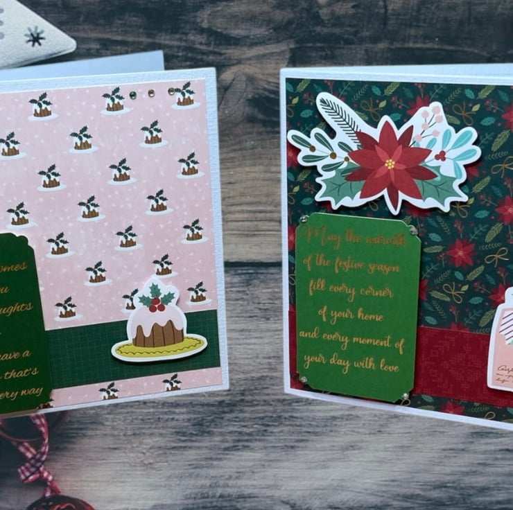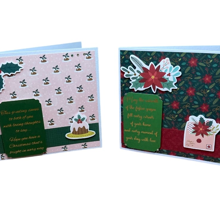 This lovely set of two cards features a festive paper overlaid with die cut tokens applied in 3D. Each card has a different design with a Poinsettia or Christmas pudding theme. The cards feature a sentiment on the front which have been added in 3D.