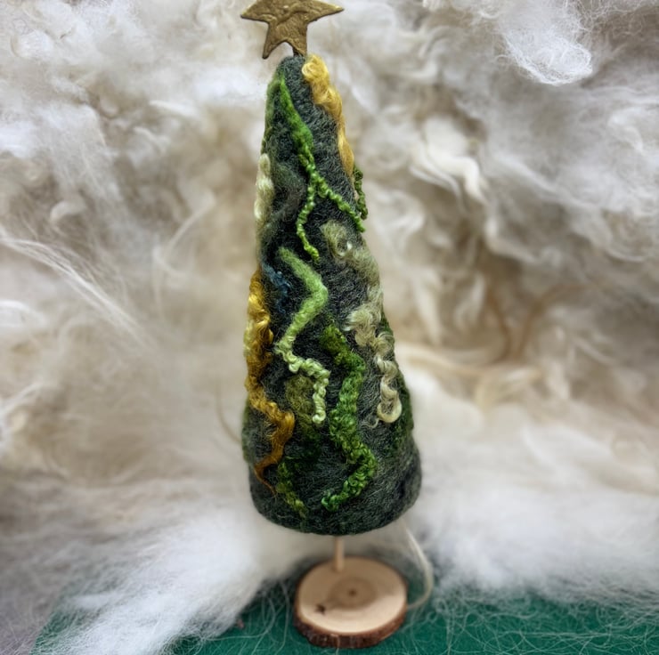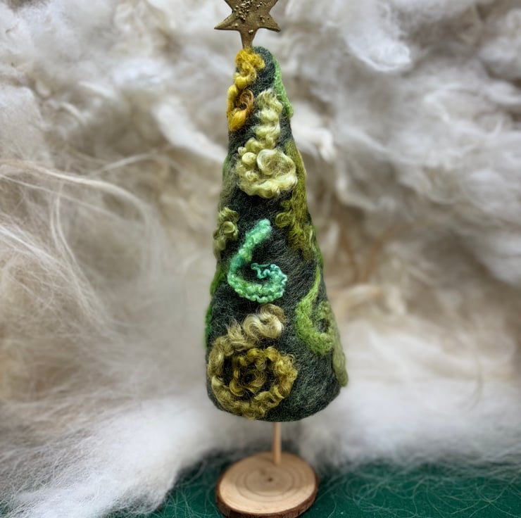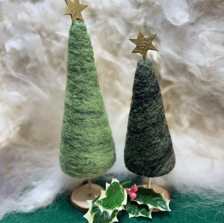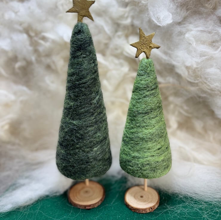 These are needle felted Christmas trees with a gold star at the top. They have a wooden trunk and stand. The star can be removed. The wool is needle felted onto a conical shape. They come as a dark green or brighter green, with or without decoration. The tall trees stand about 10 inches high and the shorter ones are 8 inches high.