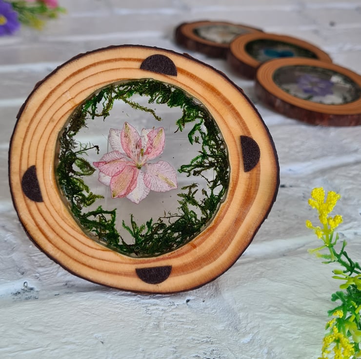 Resin encases a real dried flower inside of a natural log slice, the addition of carefully placed moss surrounding the flower, all together makes for a unique piece