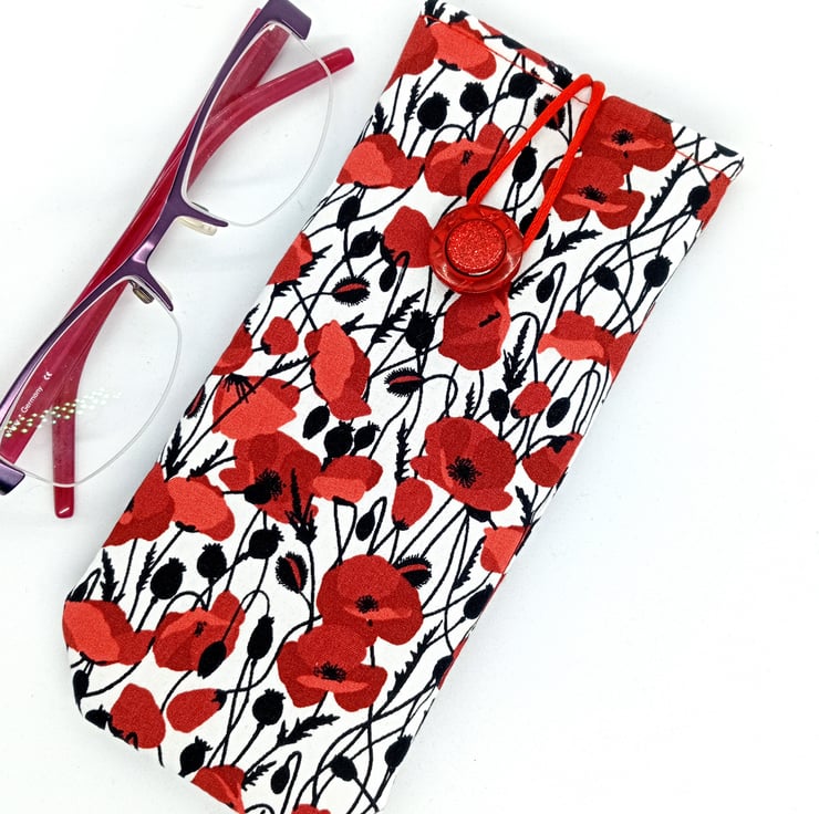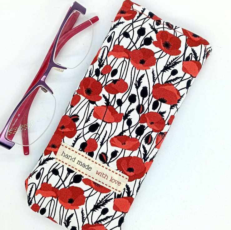 It is wadded to protect your glasses and features a hand made with love label on the back. The lining is in red cotton and It has a fabulous red button and a loop closure to keep your glasses secure.
