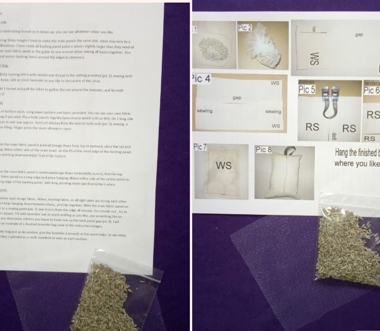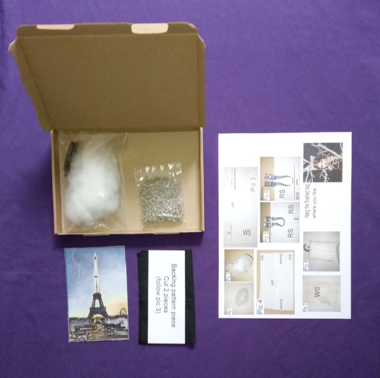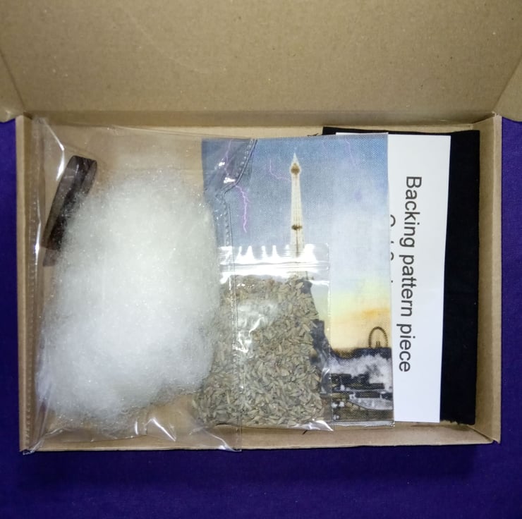 The kit comes with the main fabric, backing fabric, paper pattern piece, netting, dried lavender and stuffing, all in a box. Picture and written instructions are included.