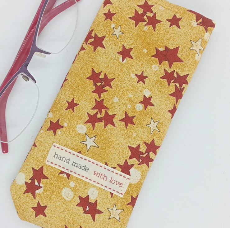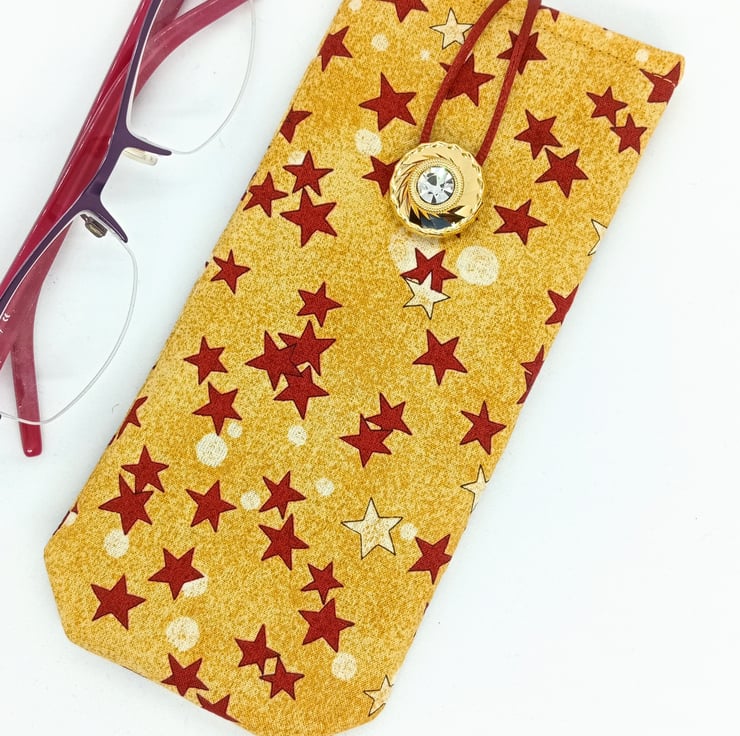 It is wadded to protect your glasses and features a hand made with love label on the back. The lining is in dark red cotton and It has a fabulous gold button and a loop closure to keep your glasses secure.