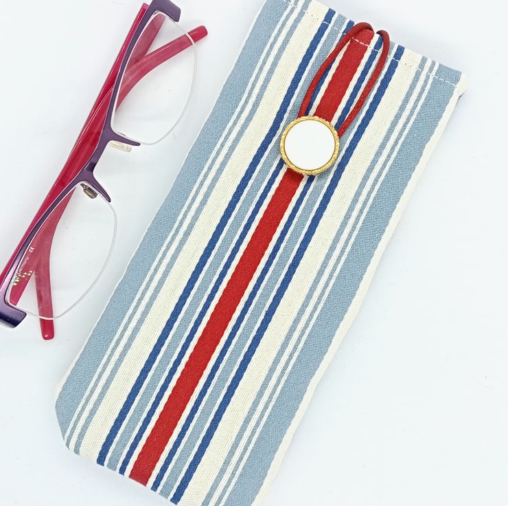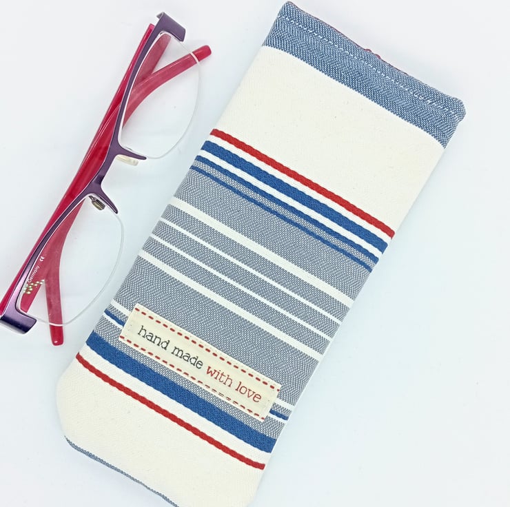 It is wadded to protect your glasses and features a hand made with love label on the back. The lining is in dark red cotton and It has a white button and a loop closure to keep your glasses secure.