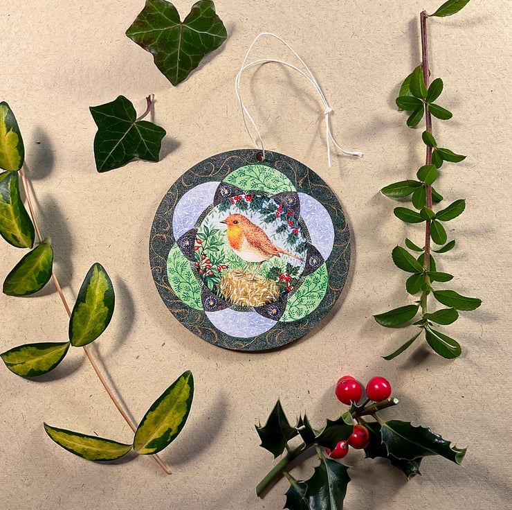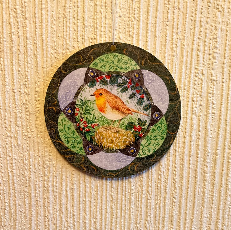 I painted the robin mandala miniature for an exhibition I took part in London for the Royal Society of Miniature Painters, Sculptors and Gravers, of which I am a member. I sold the original painting but wanted to make some prints. I thought the image lent itself to a hanging decoration so set about looking into the possibility of printing onto wood. I was delighted in the way it turned out. Each year I buy my Christmas tree a present, one special heirloom decoration, I hope this may become one of those.